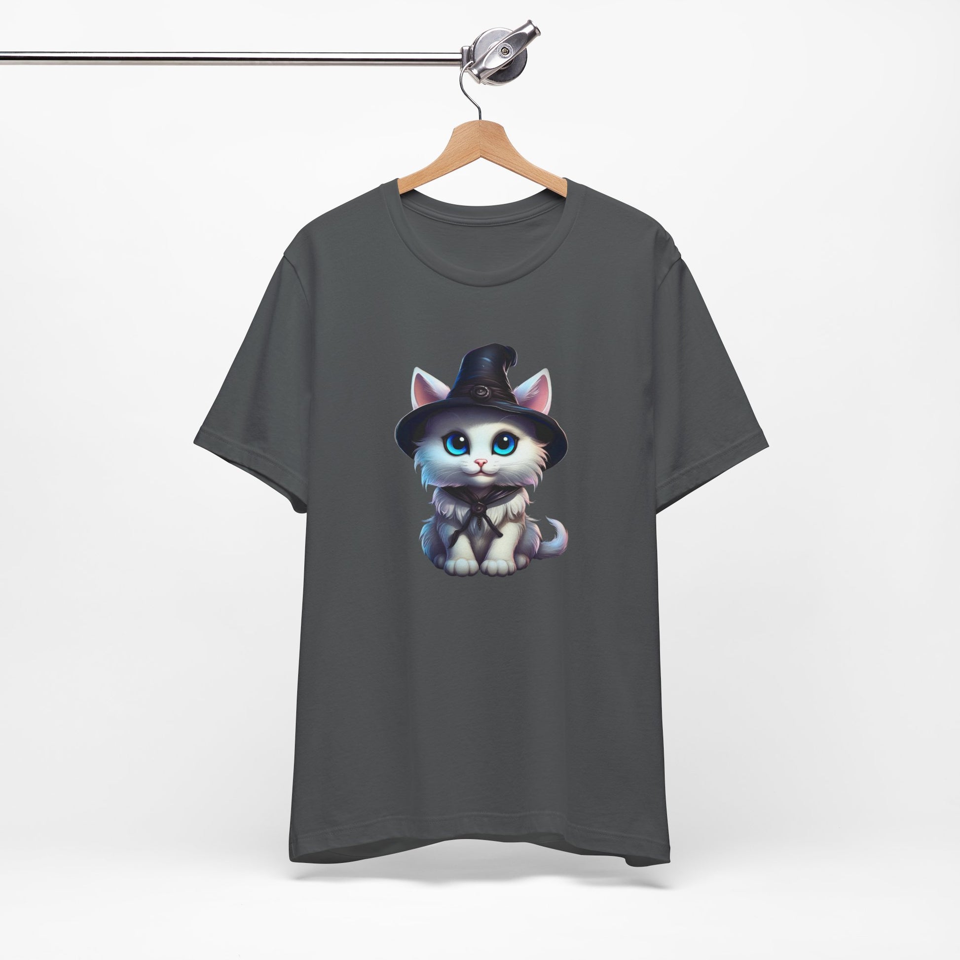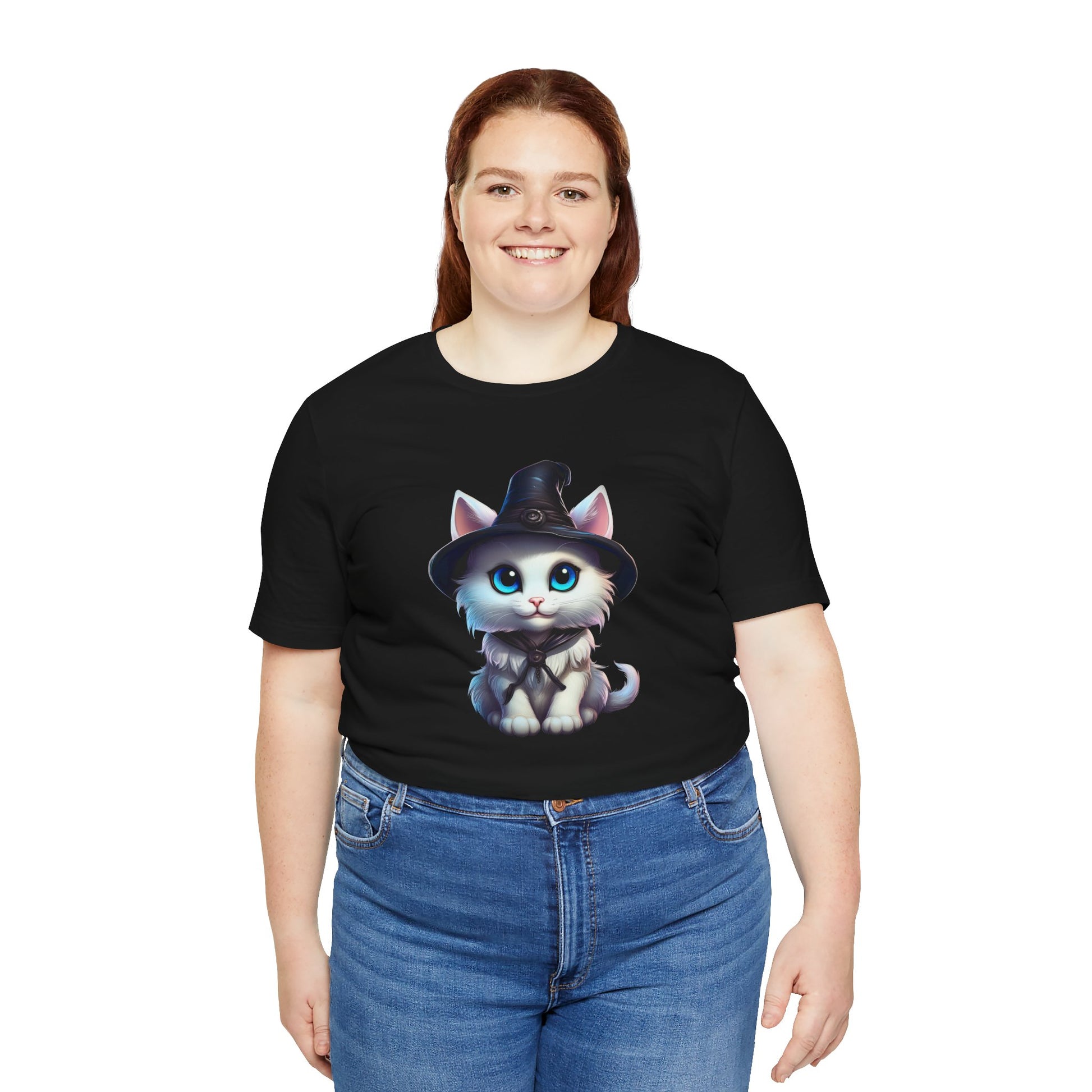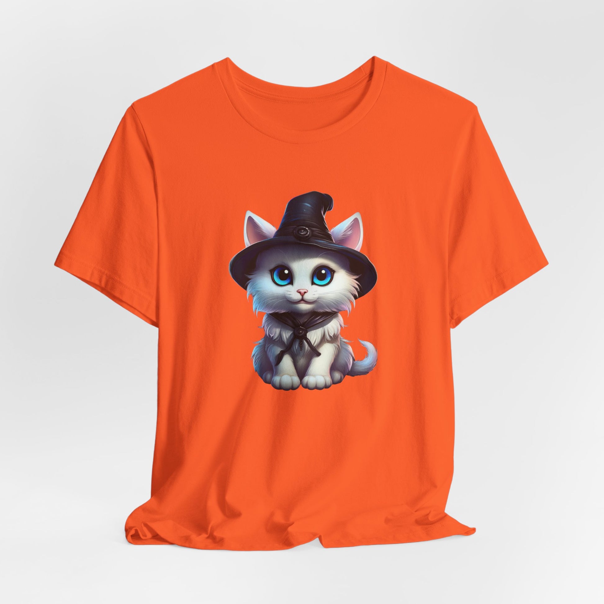 Adorable Witch Cat Halloween Shirt – Cute White Cat in Hat Graphic Tee for Cat Lovers and Halloween Fans