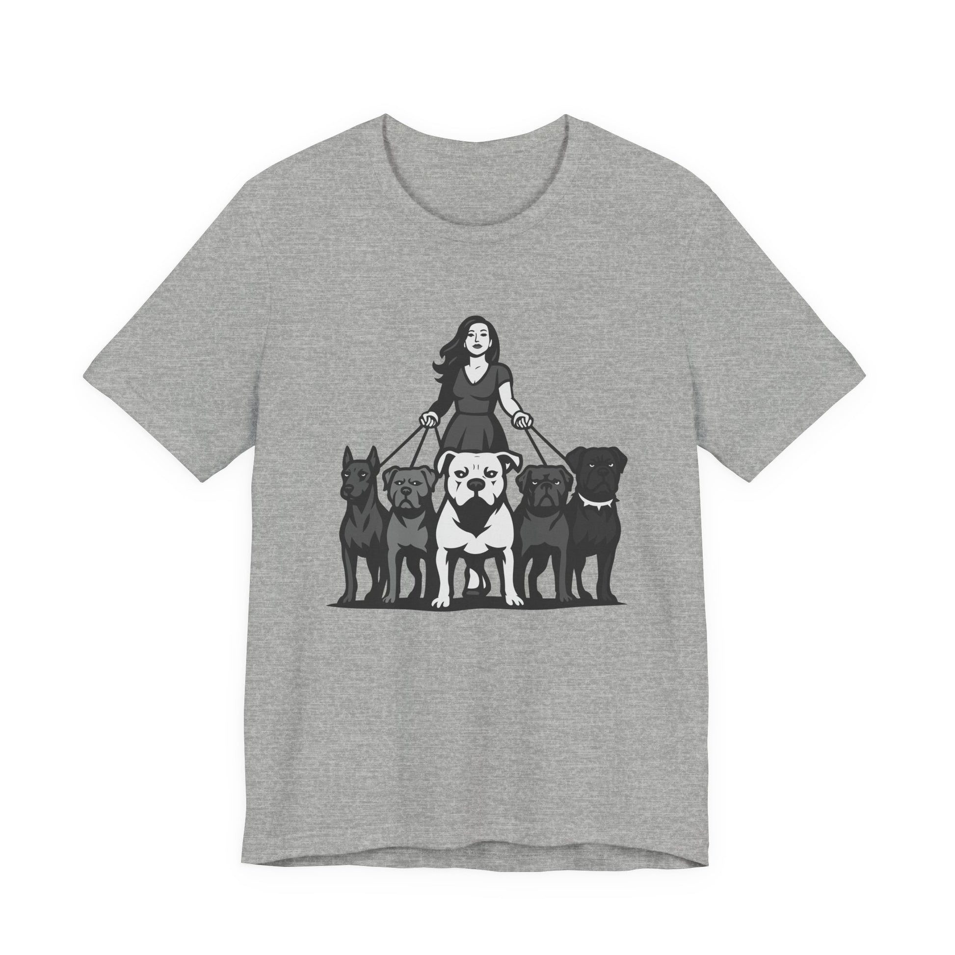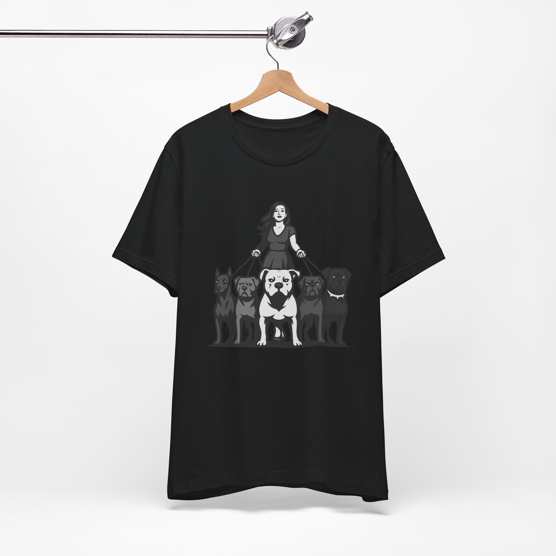 Alpha Woman with Dog Pack Graphic Tee Dark Theme – Confident Dog Walker Vector Design