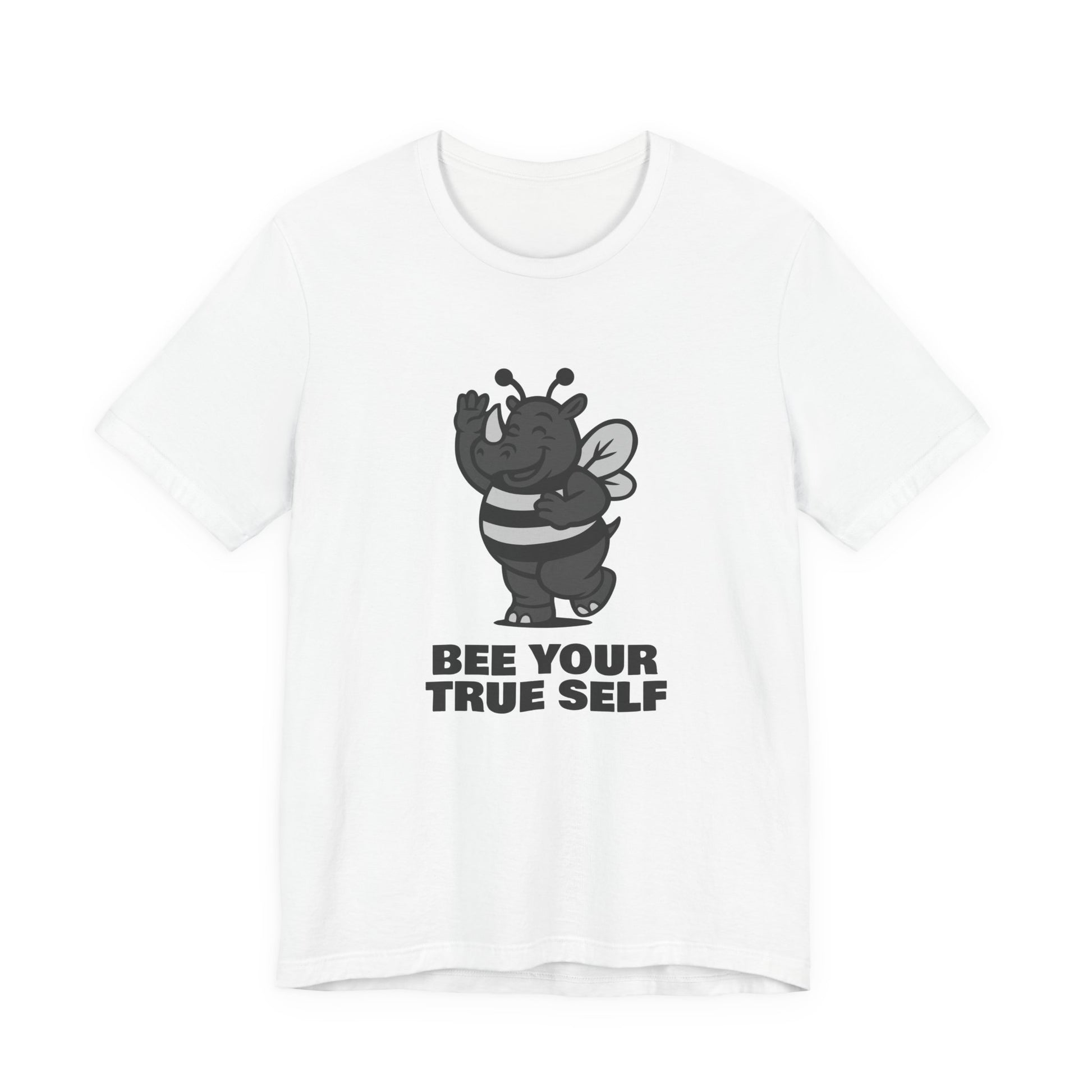 Bee Your True Self T-Shirt – Dark Theme Grayscale Rhino in Bee Costume on Black Tee with Wholesome Humor and Self-Expression Message. Unisex Jersey Short Sleeve Tee