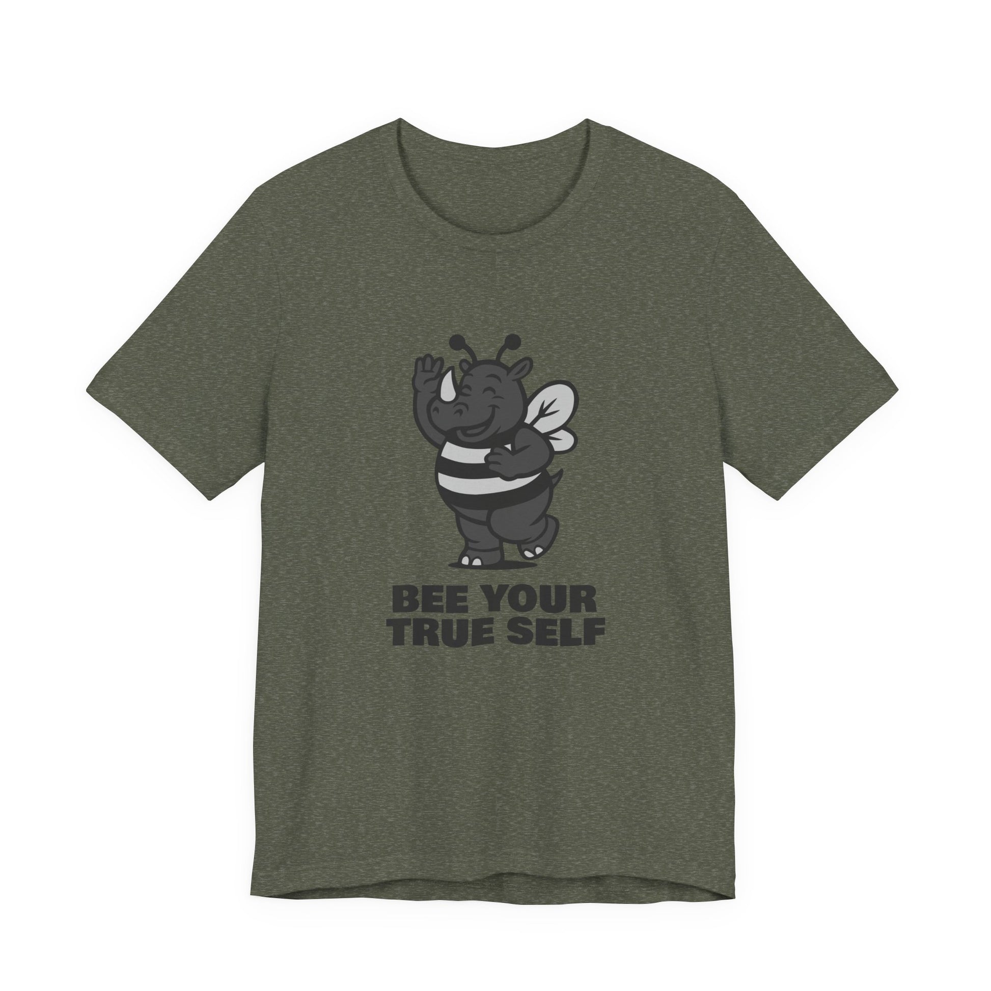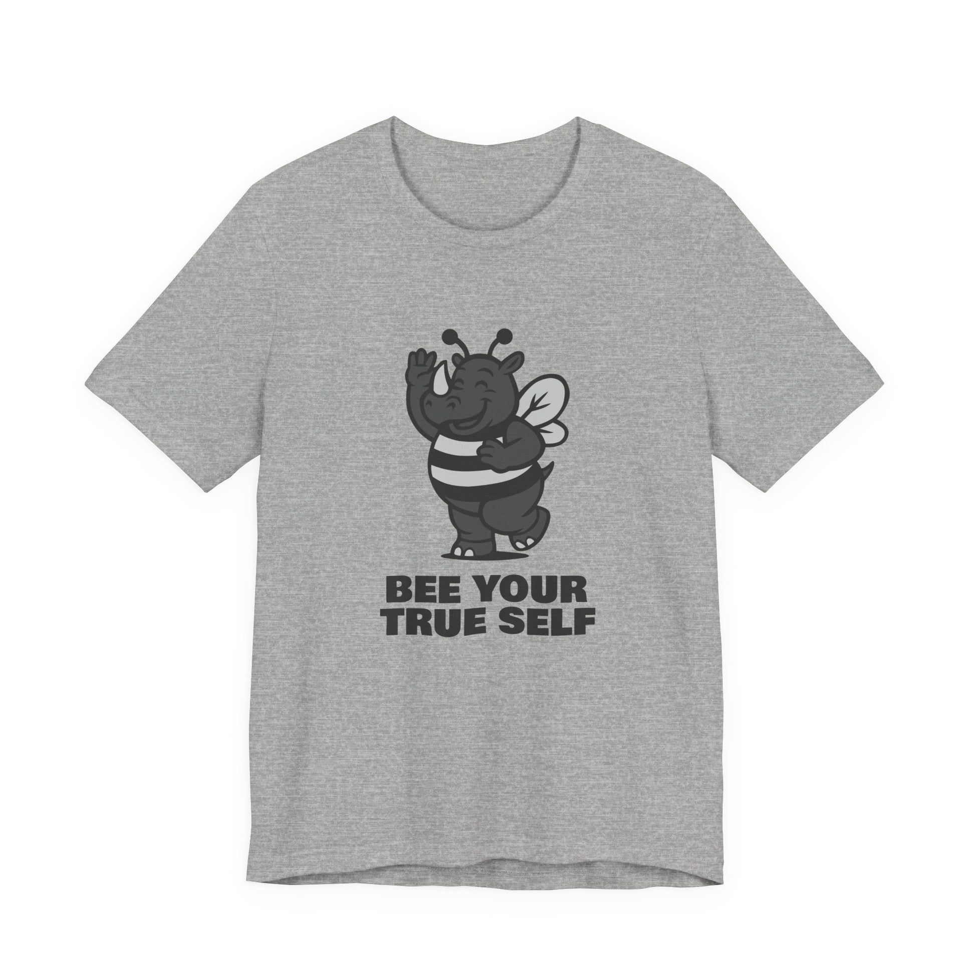 Celebrate bold self-expression with this cheerful “Bee Your True Self” tee featuring a smiling rhino in a bee outfit. The grayscale design offers a playful twist on being unapologetically you. Printed with a modern ghost effect, it’s a subtle, low-contrast graphic that speaks volumes without shouting—perfect for those who like their humor and style on the quiet side.