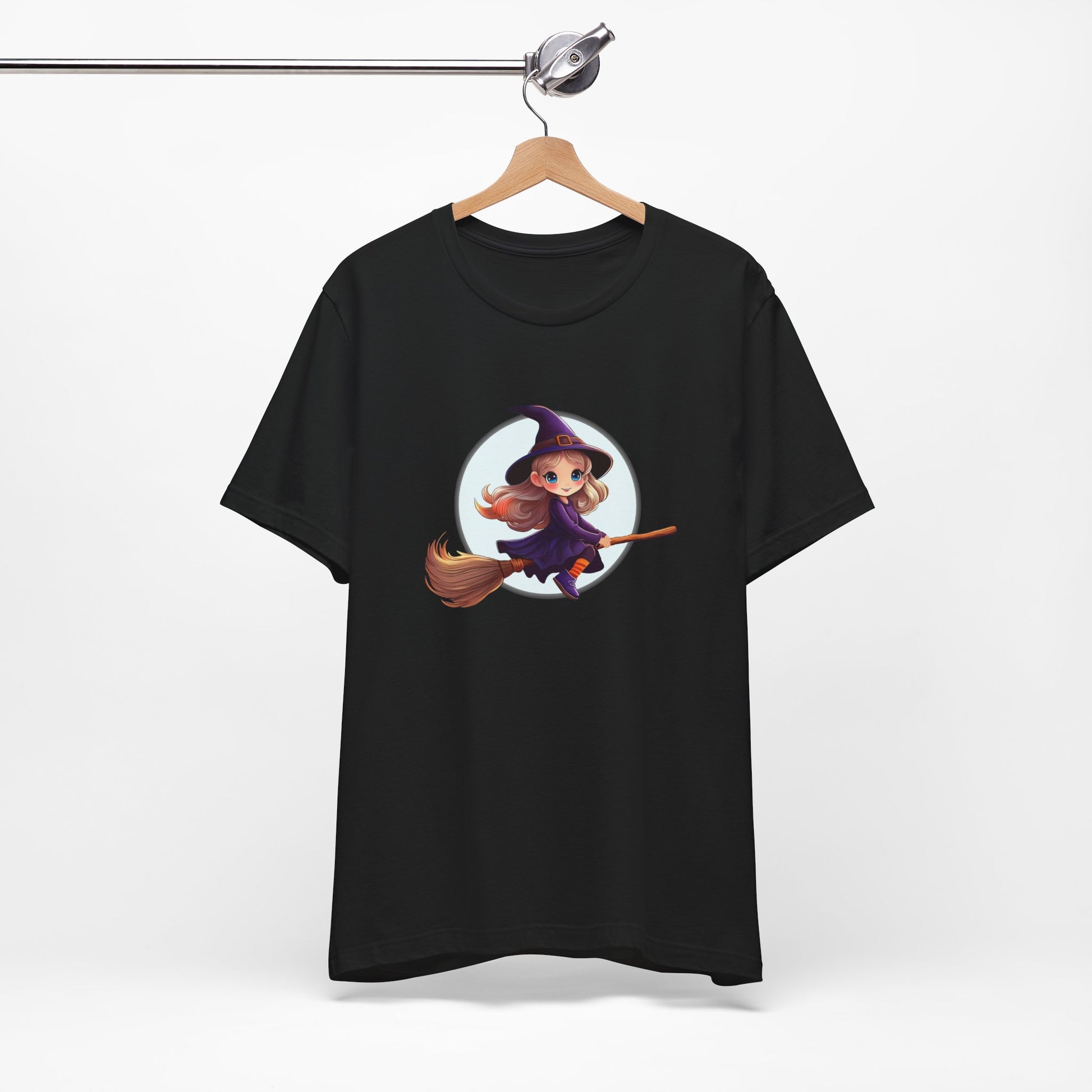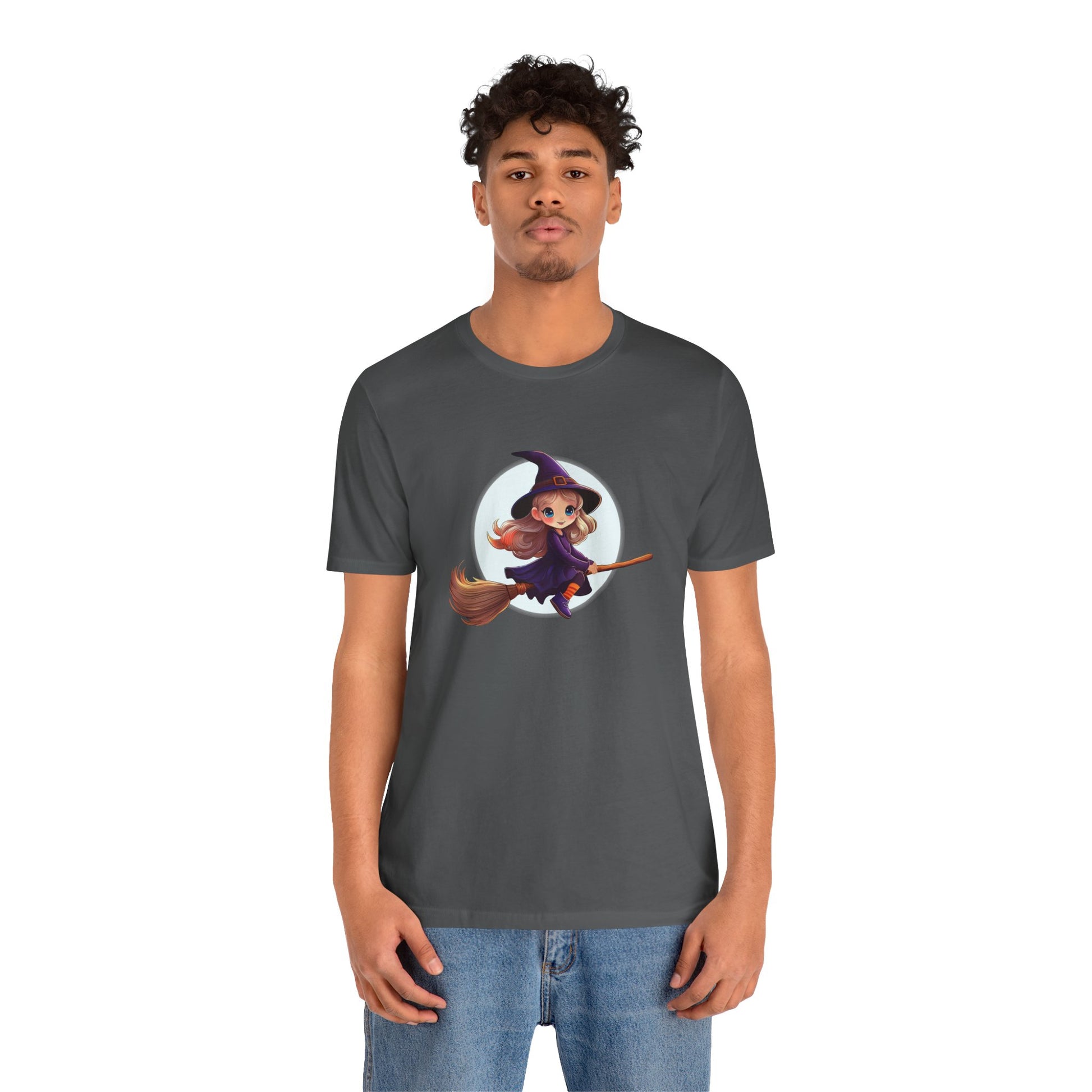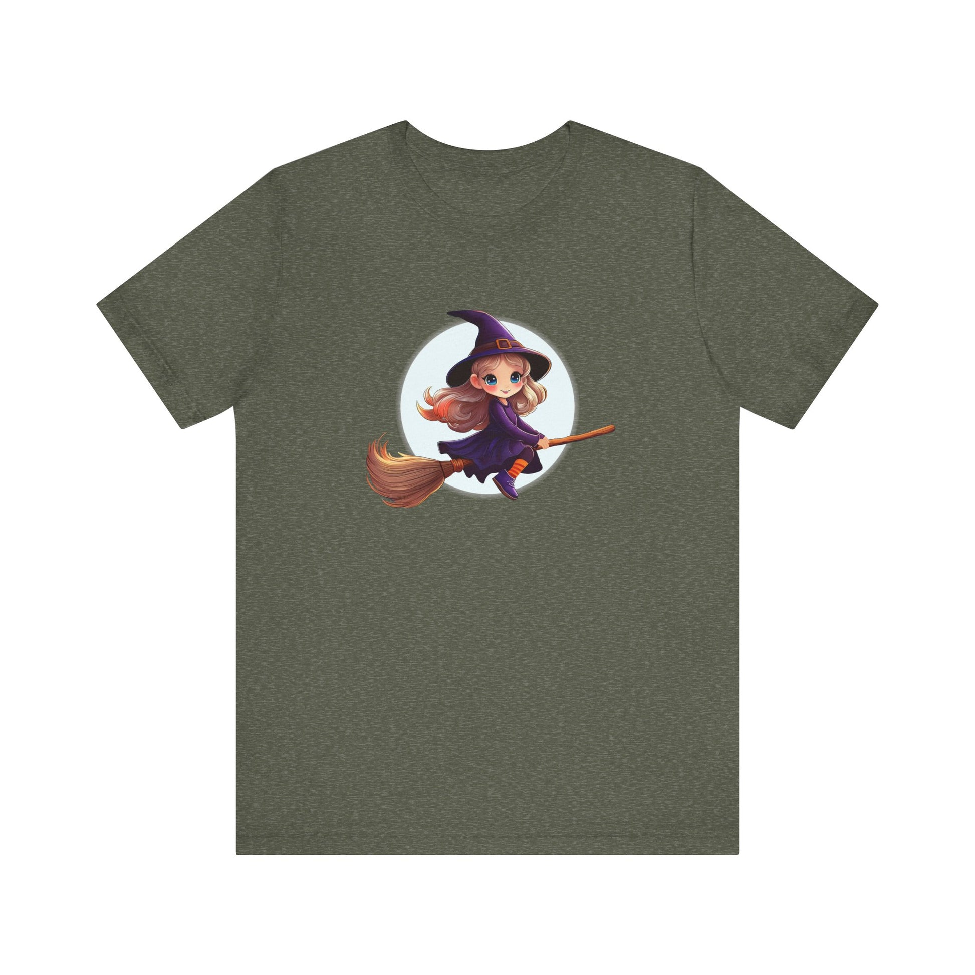 Fly into Halloween with this charming graphic tee featuring a sweet cartoon witch with flowing hair, striped socks, and a classic pointed hat, riding her broom against a moonlit sky. With big sparkling eyes and a friendly smile, this good witch brings cozy, magical vibes to spooky season. Perfect for kids, parents, or anyone who prefers cute over creepy, this Halloween shirt is ideal for trick-or-treating, school parties, or just showing off your love for all things witchy and whimsical.