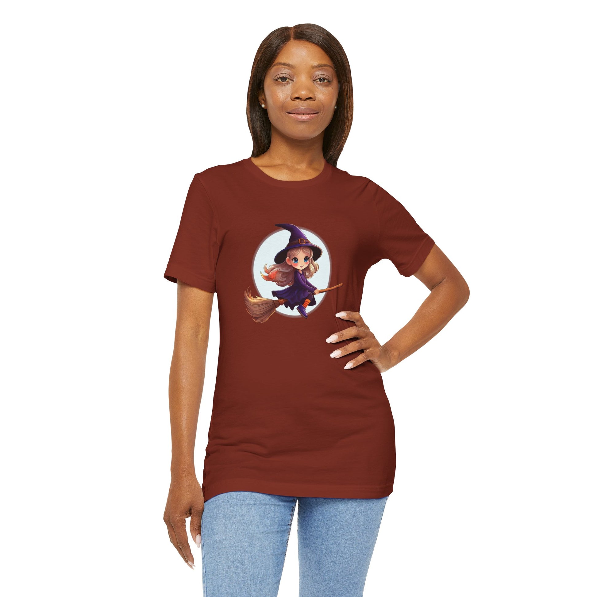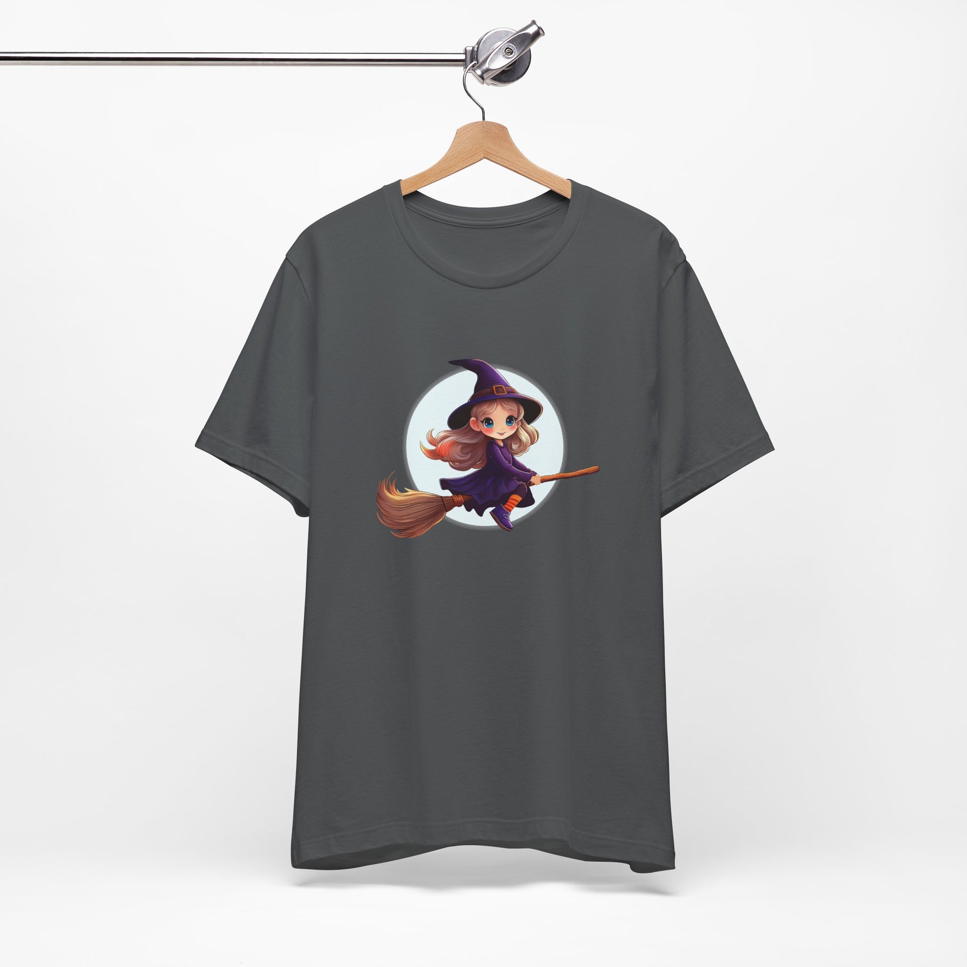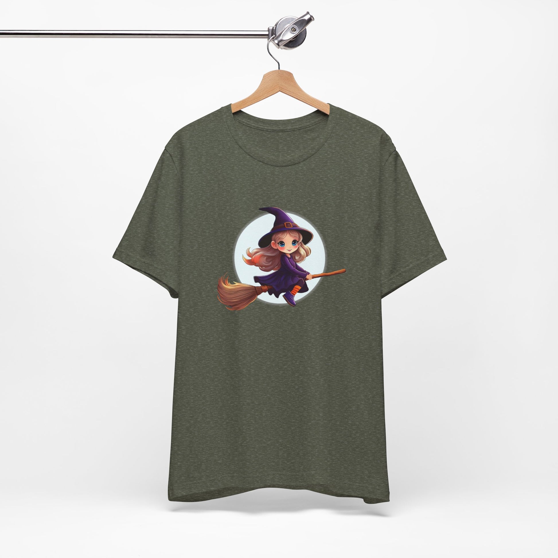 Fly into Halloween with this charming graphic tee featuring a sweet cartoon witch with flowing hair, striped socks, and a classic pointed hat, riding her broom against a moonlit sky. With big sparkling eyes and a friendly smile, this good witch brings cozy, magical vibes to spooky season. Perfect for kids, parents, or anyone who prefers cute over creepy, this Halloween shirt is ideal for trick-or-treating, school parties, or just showing off your love for all things witchy and whimsical.