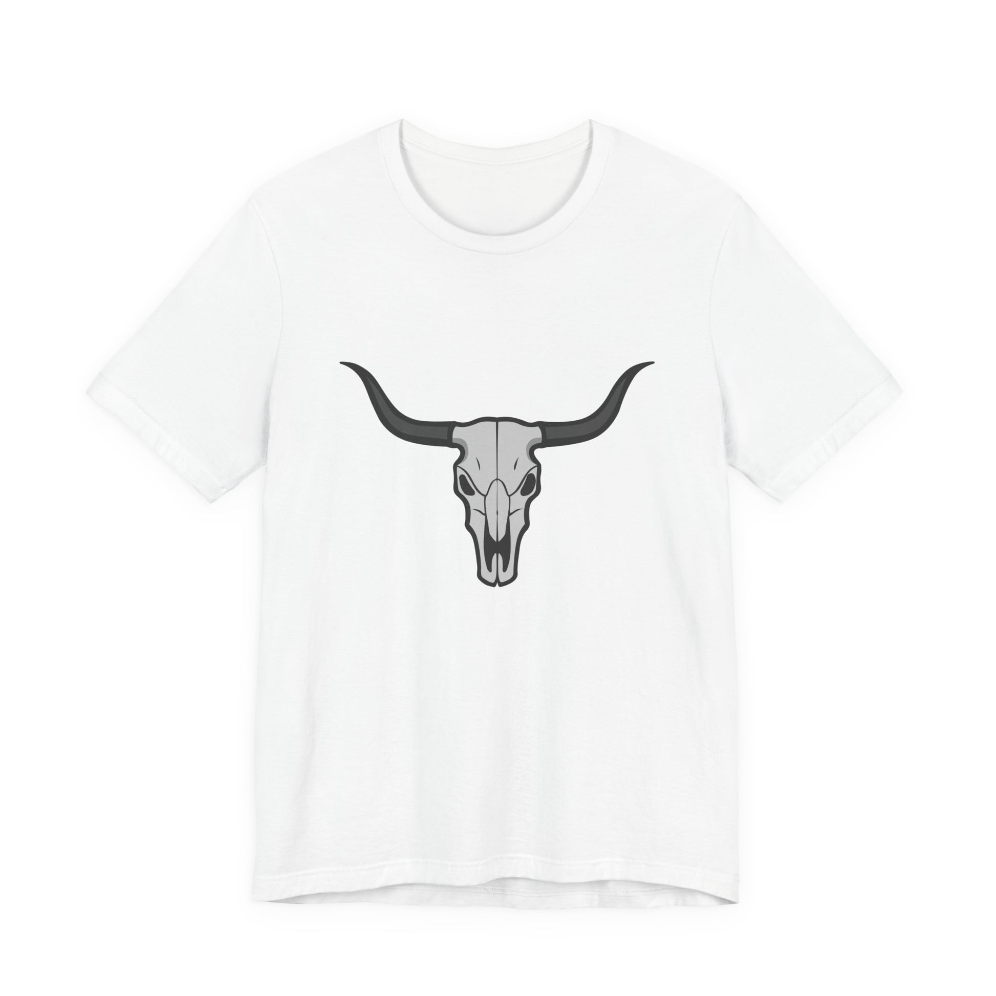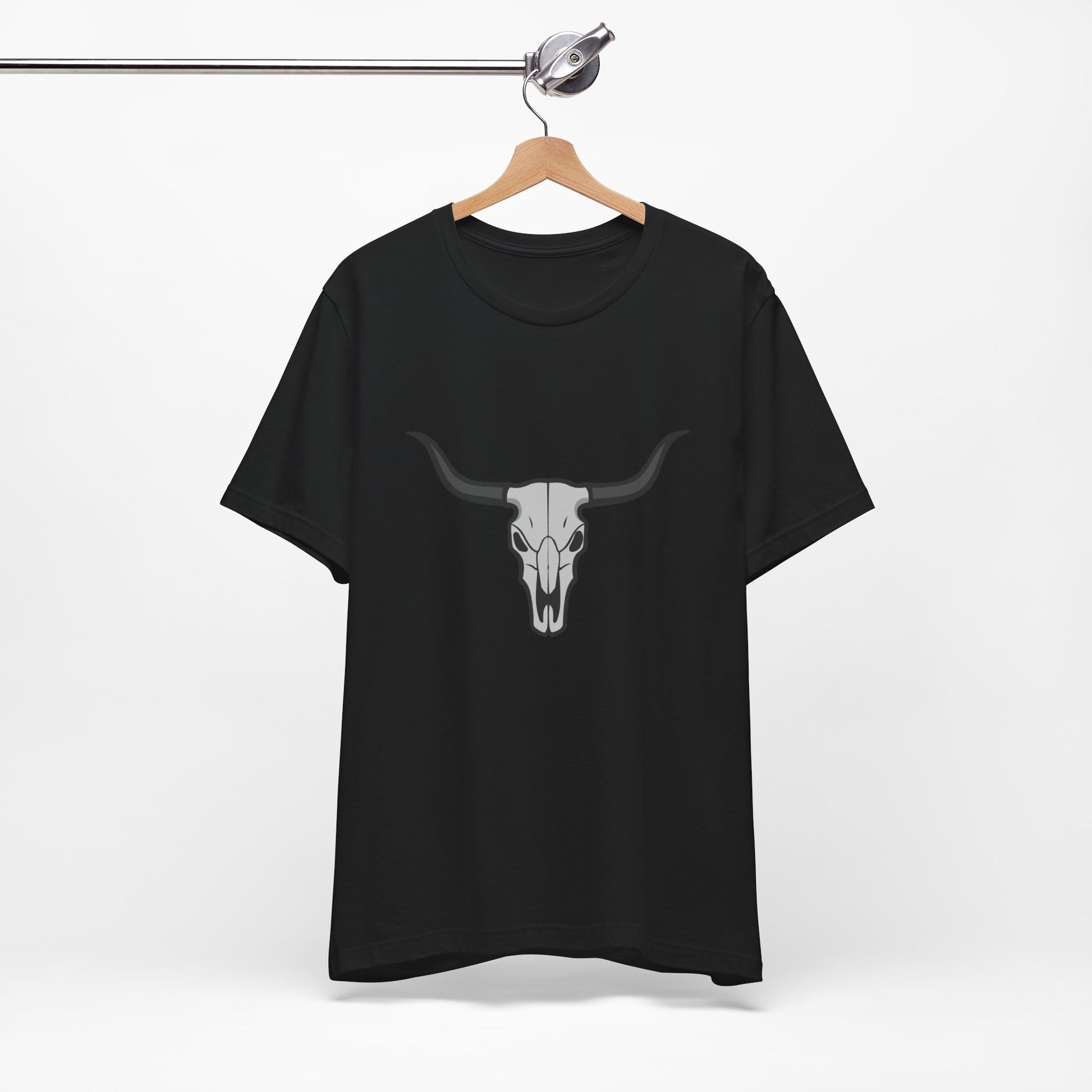 Dark Theme Steer Skull Shirt – Western Cow Skull Graphic in Grey and Black for Desert Gothic Vibes. Unisex Jersey Short Sleeve Tee