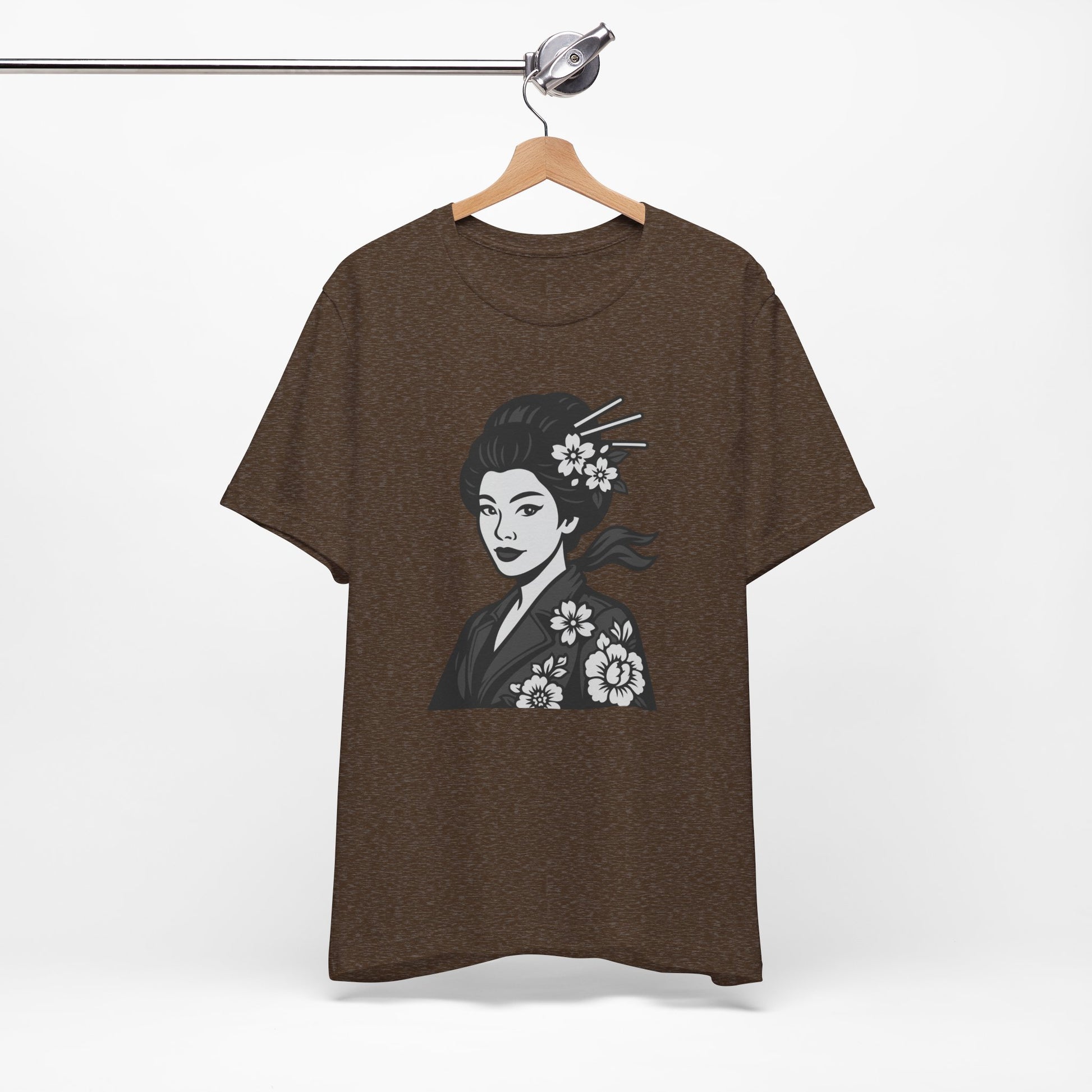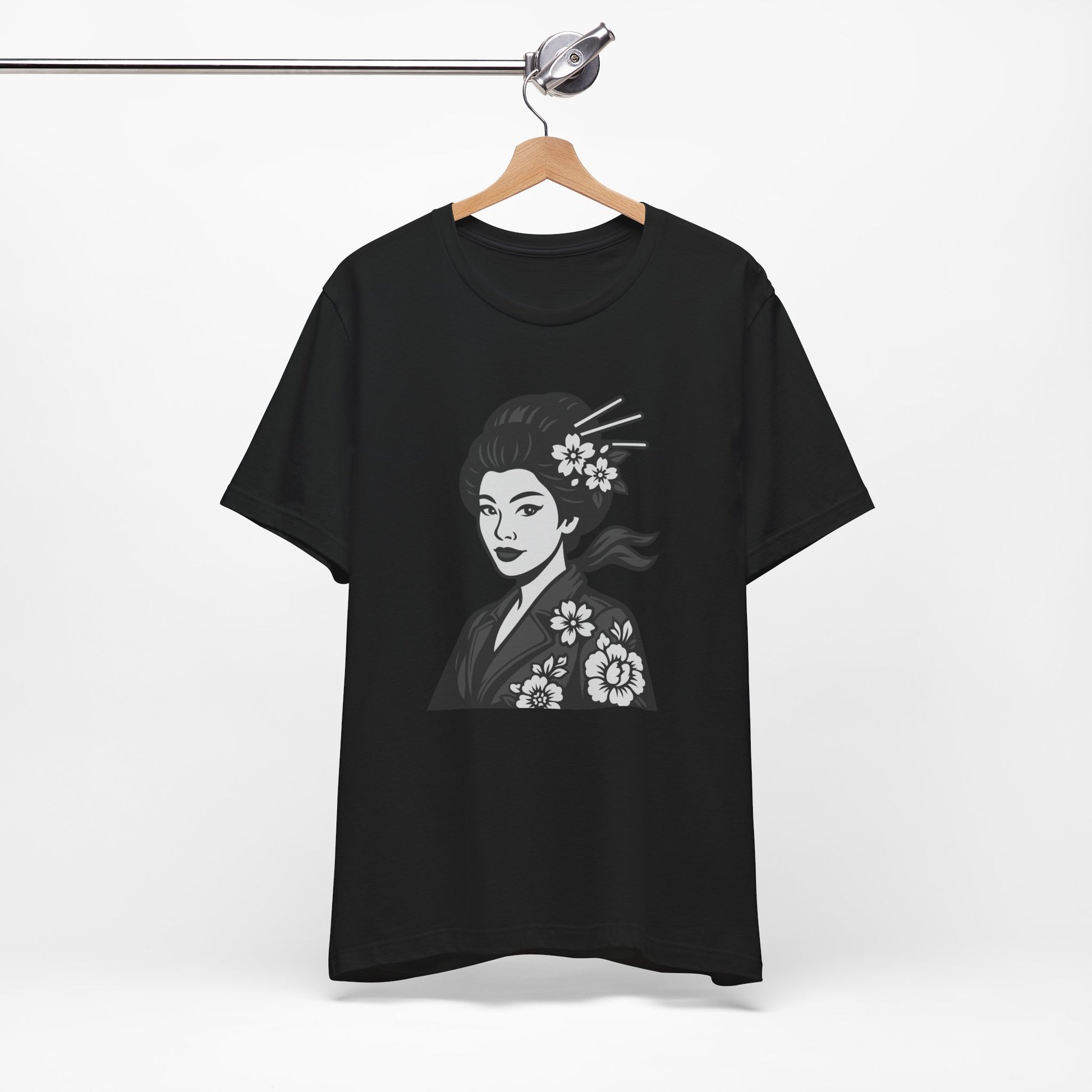 Floral Geisha Graphic Tee Dark Theme – Elegant Vector Portrait with Modern Ghost Effect