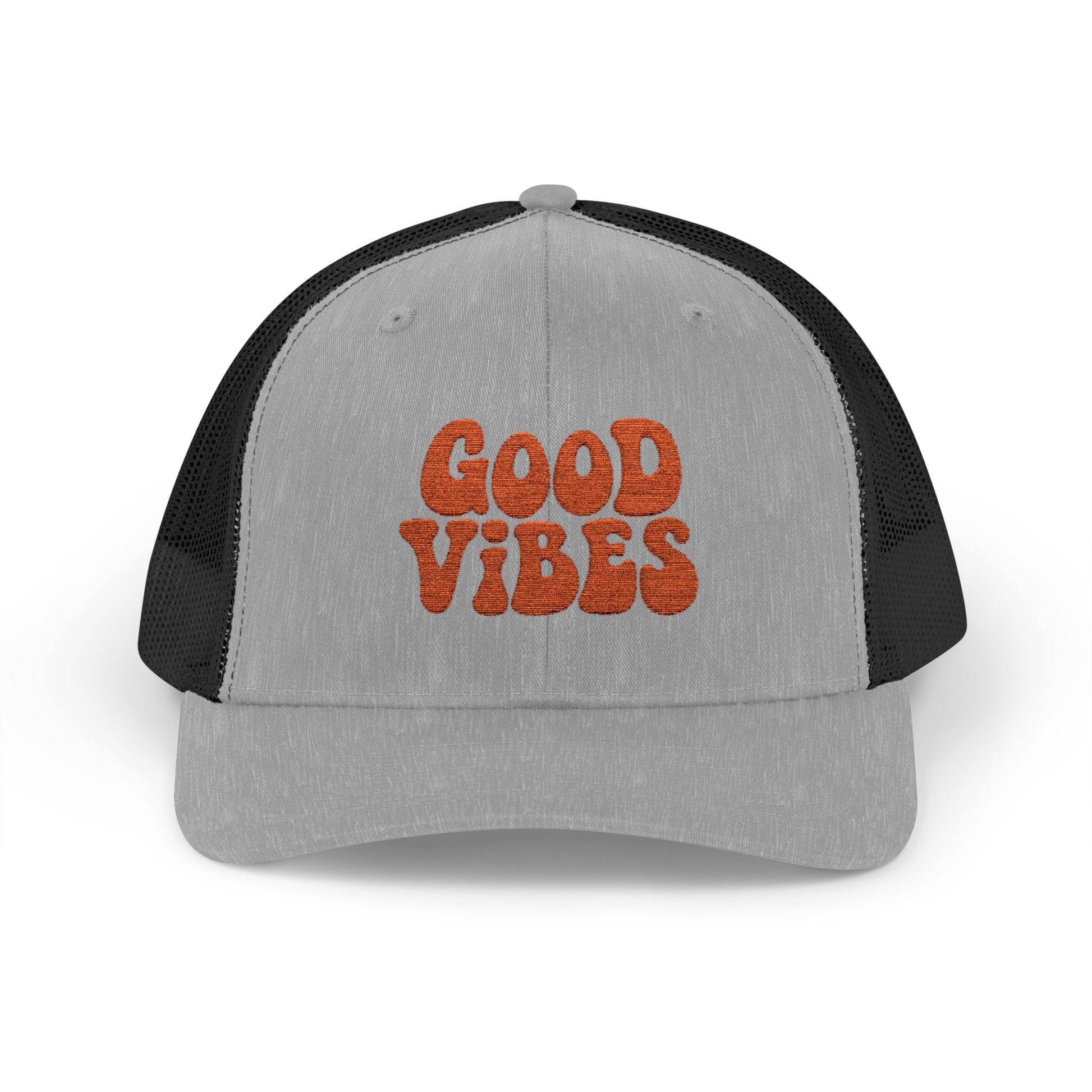 Good Vibes Trucker Hat – Embroidered Retro Text Hat for Positive Vibes, Chill Style, and Everyday Feel-Good Energy. Orange Letters