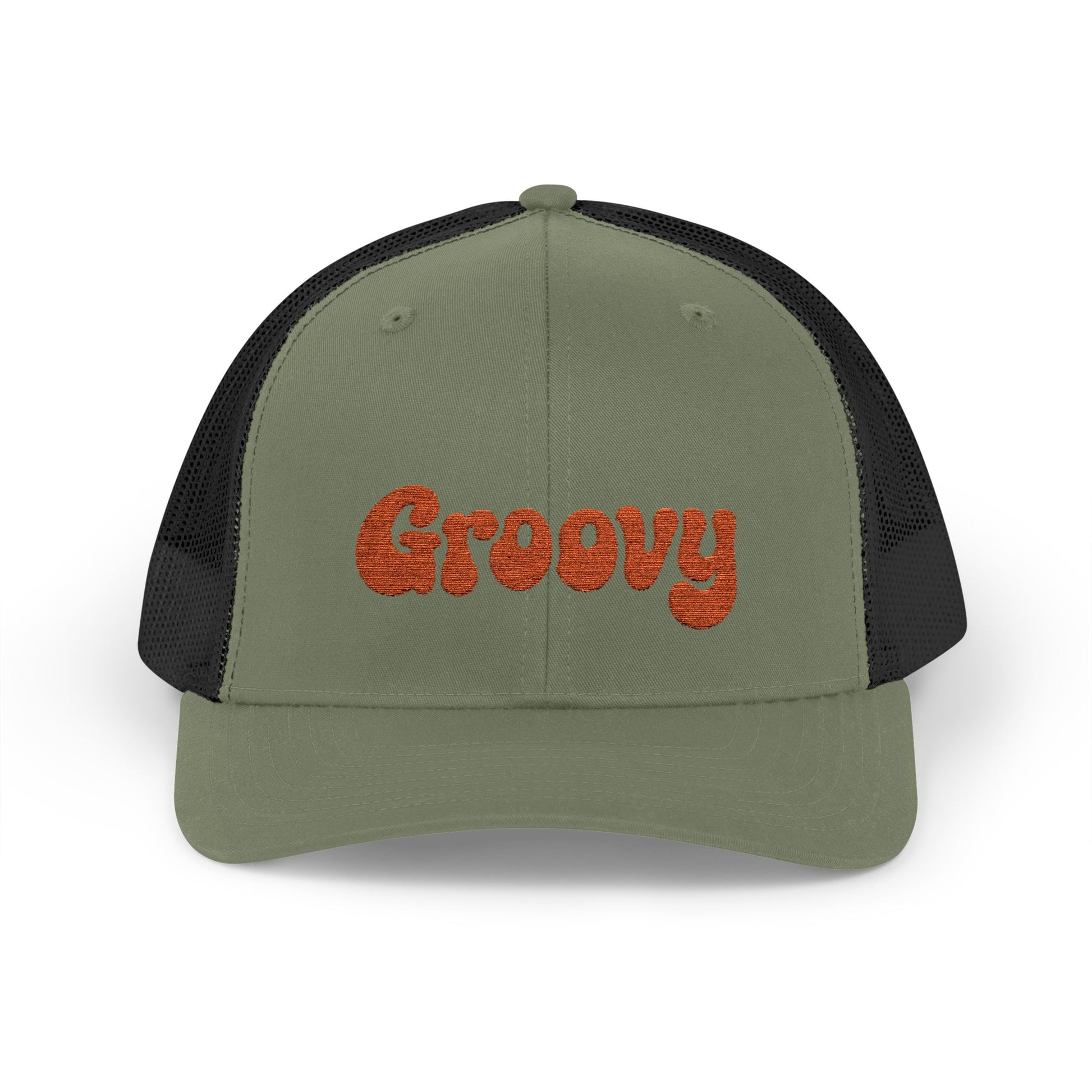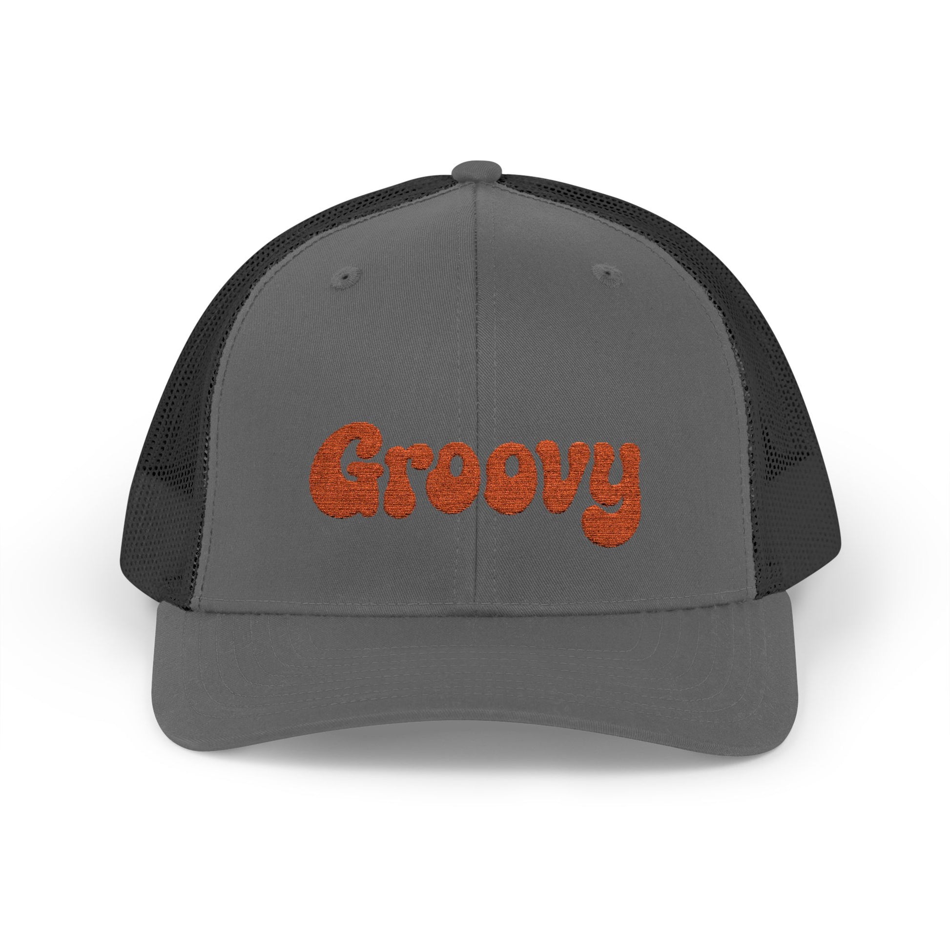 Groovy Trucker Hat – Retro Embroidered Hat with 70s Style Font for Funky Vibes, Chill Days, and Vintage Cool. Orange Letters