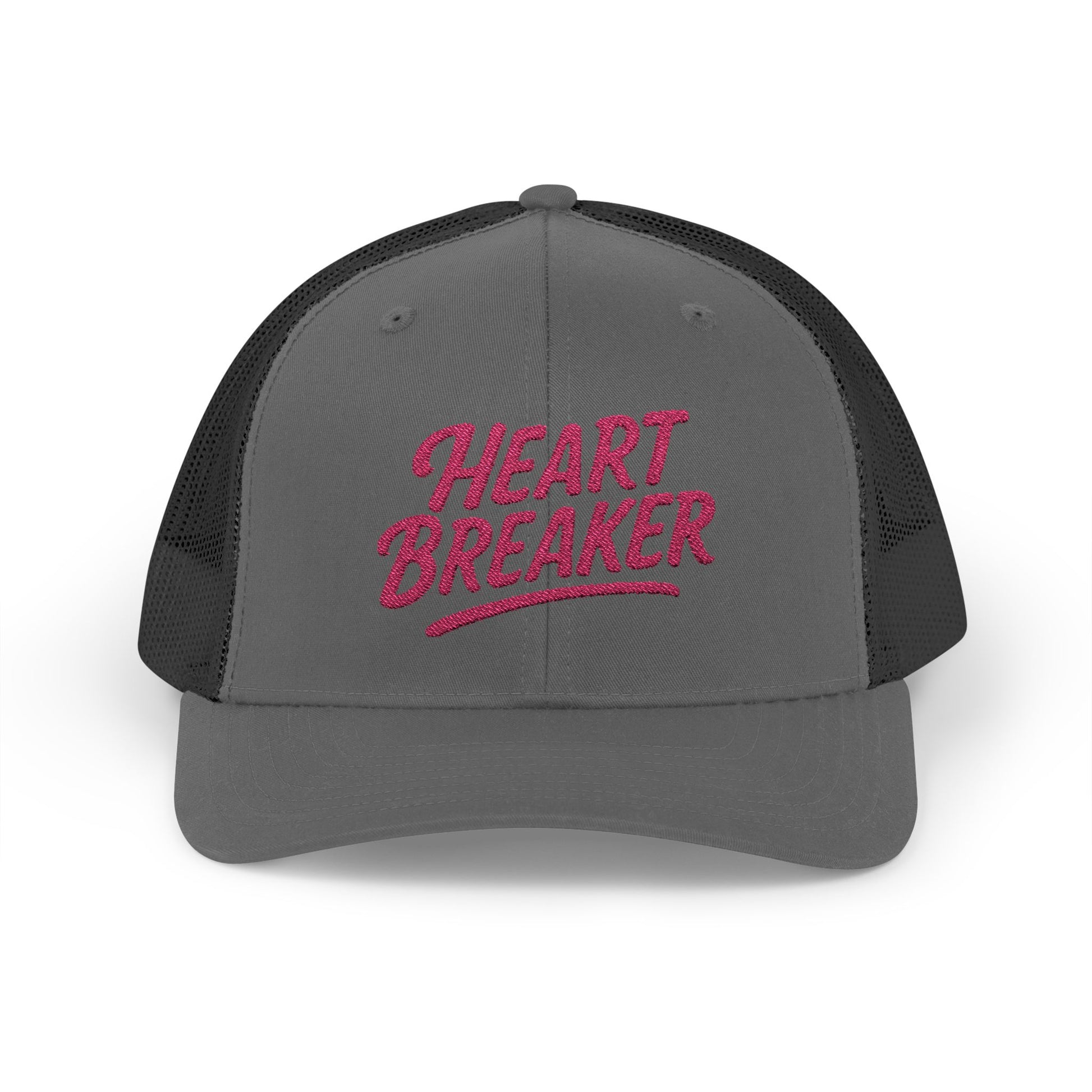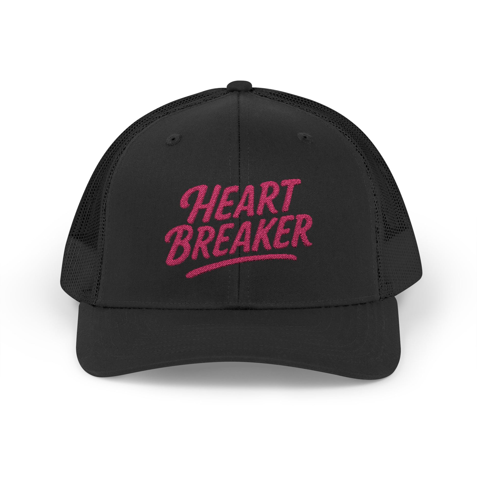 Heartbreaker Trucker Hat – Bold Baseball Hat with Retro Script and Broken Heart Design for Confident Rule-Breakers. Pink Letters