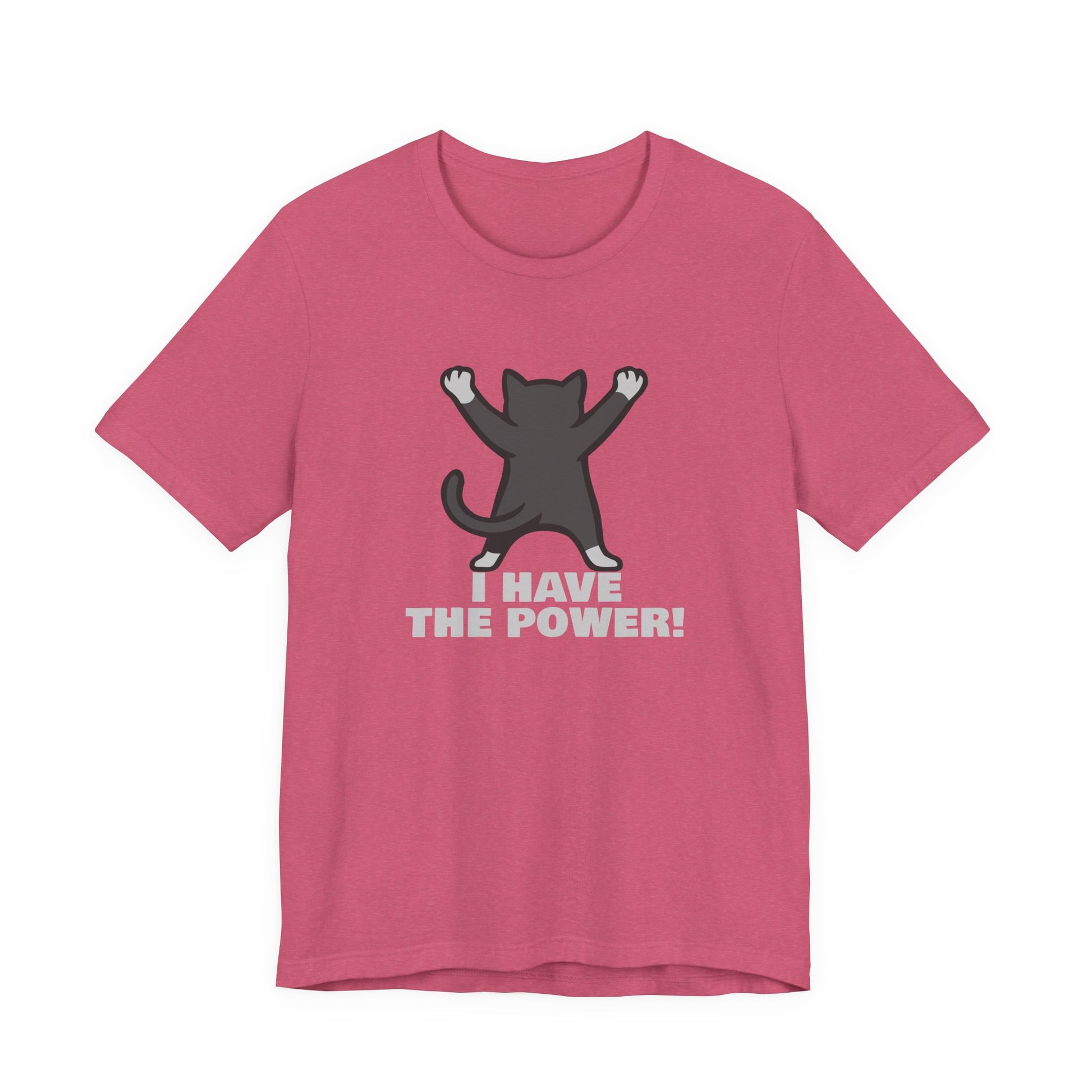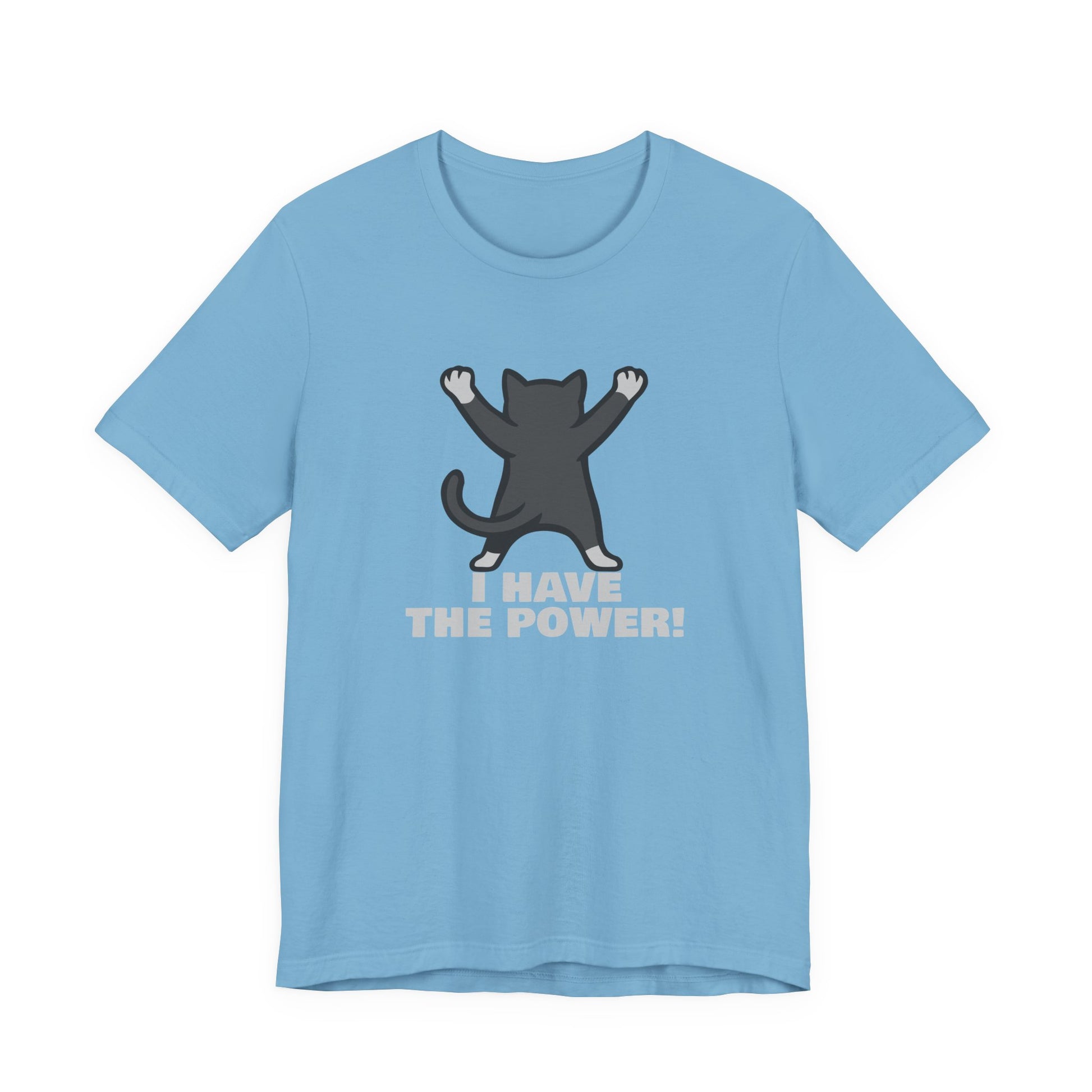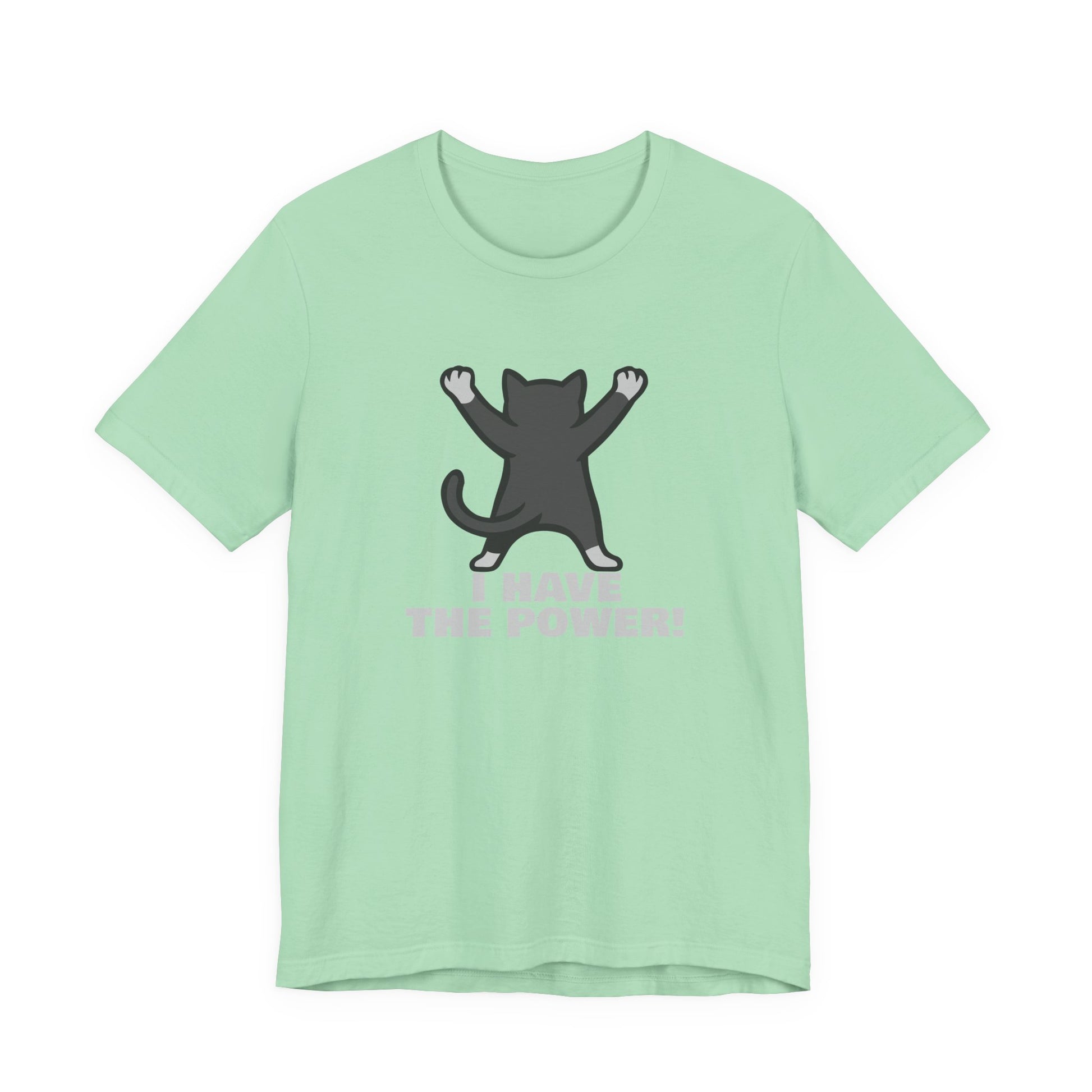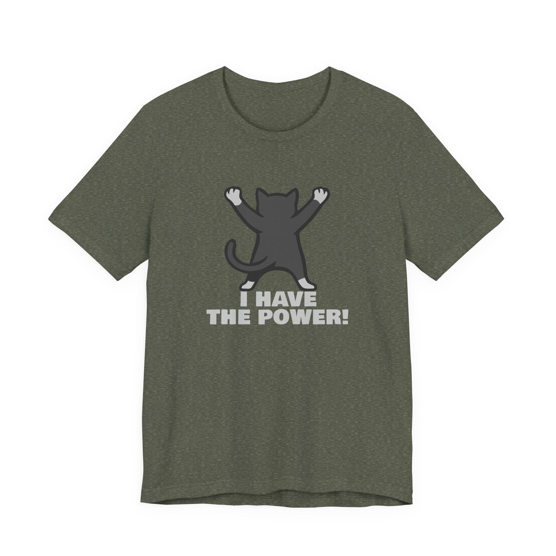 I Have the Power Cat Shirt – Hilarious Victory Pose in Dark Theme Feline Graphic Style. Unisex Jersey Short Sleeve Tee