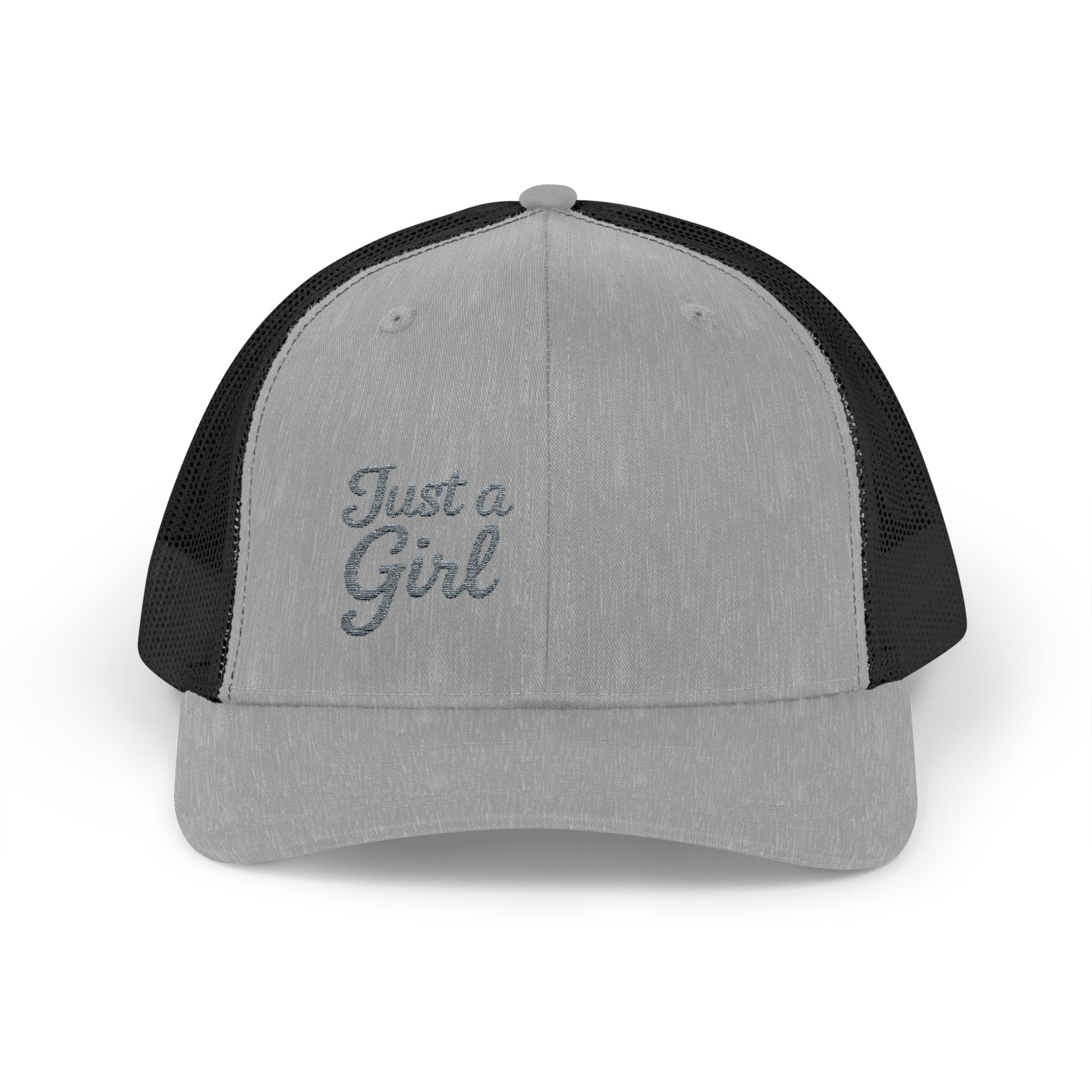 Just a Girl Trucker Hat – Minimalist Script Hat with Bold Feminine Energy and Classic Style. Grey Letters
