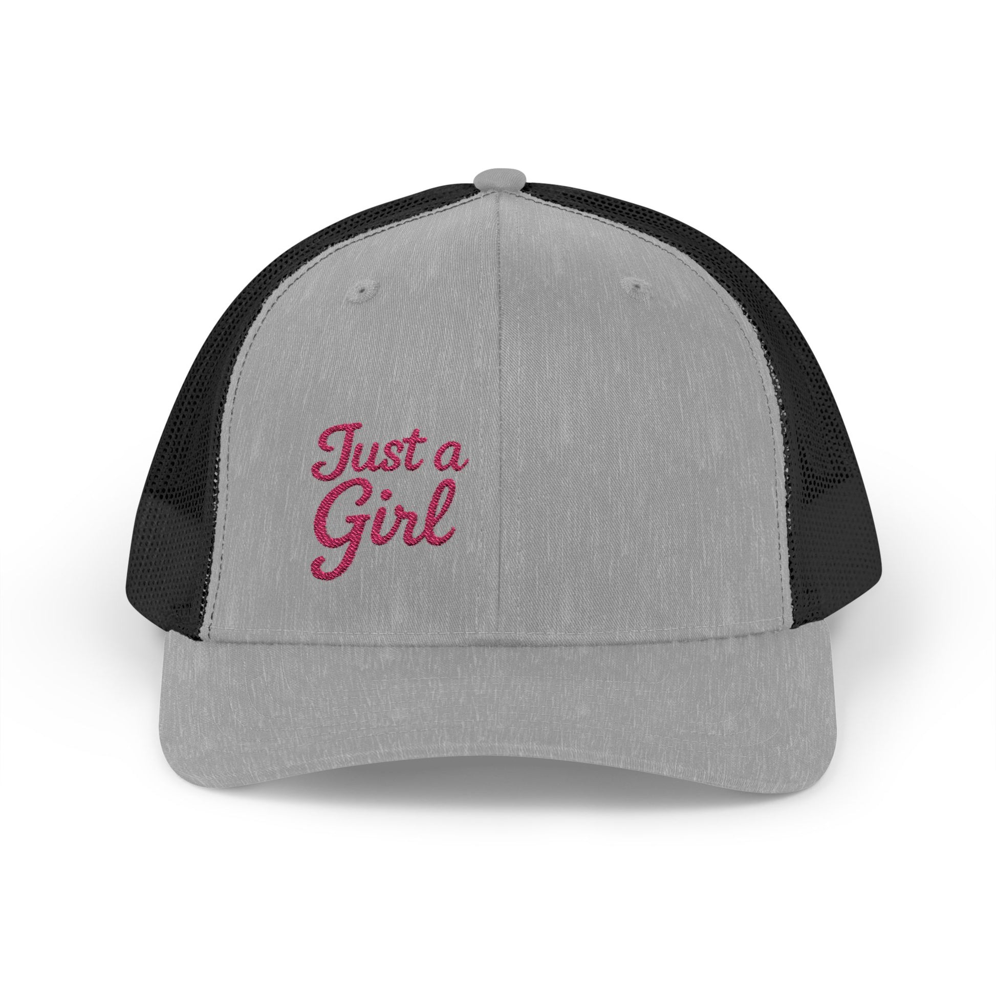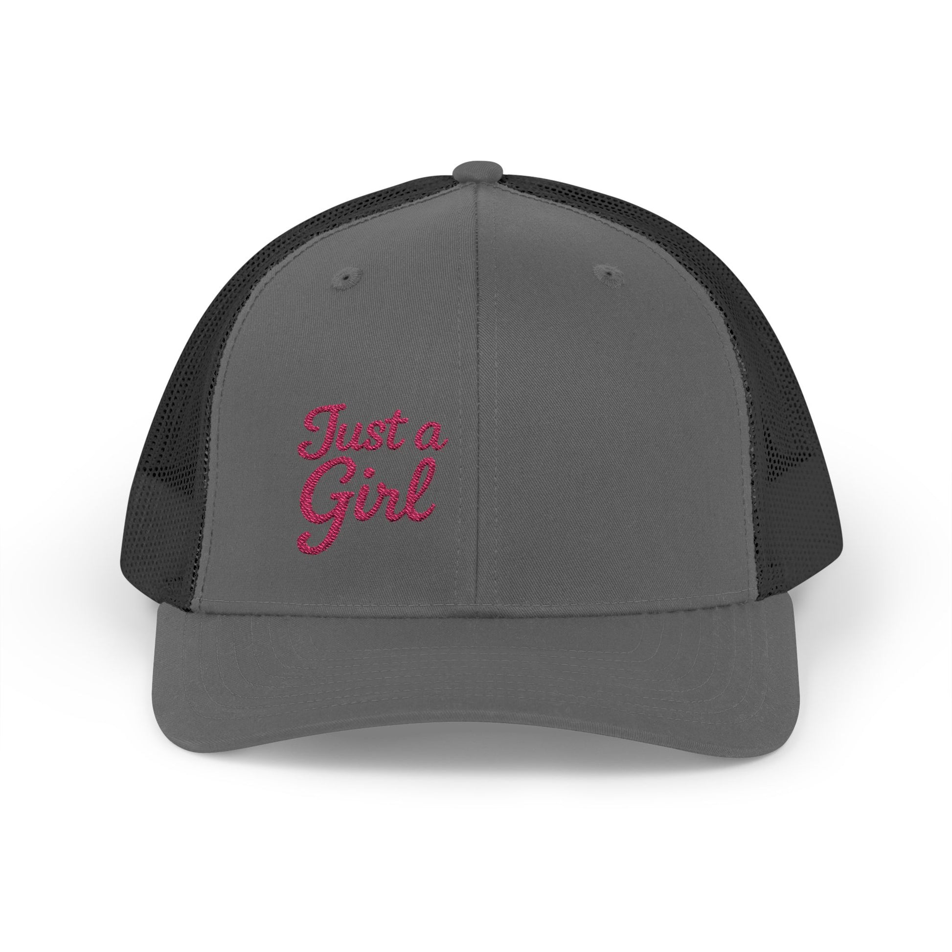 Just a Girl Trucker Hat – Minimalist Script Hat with Bold Feminine Energy and Classic Style. Pink Letters