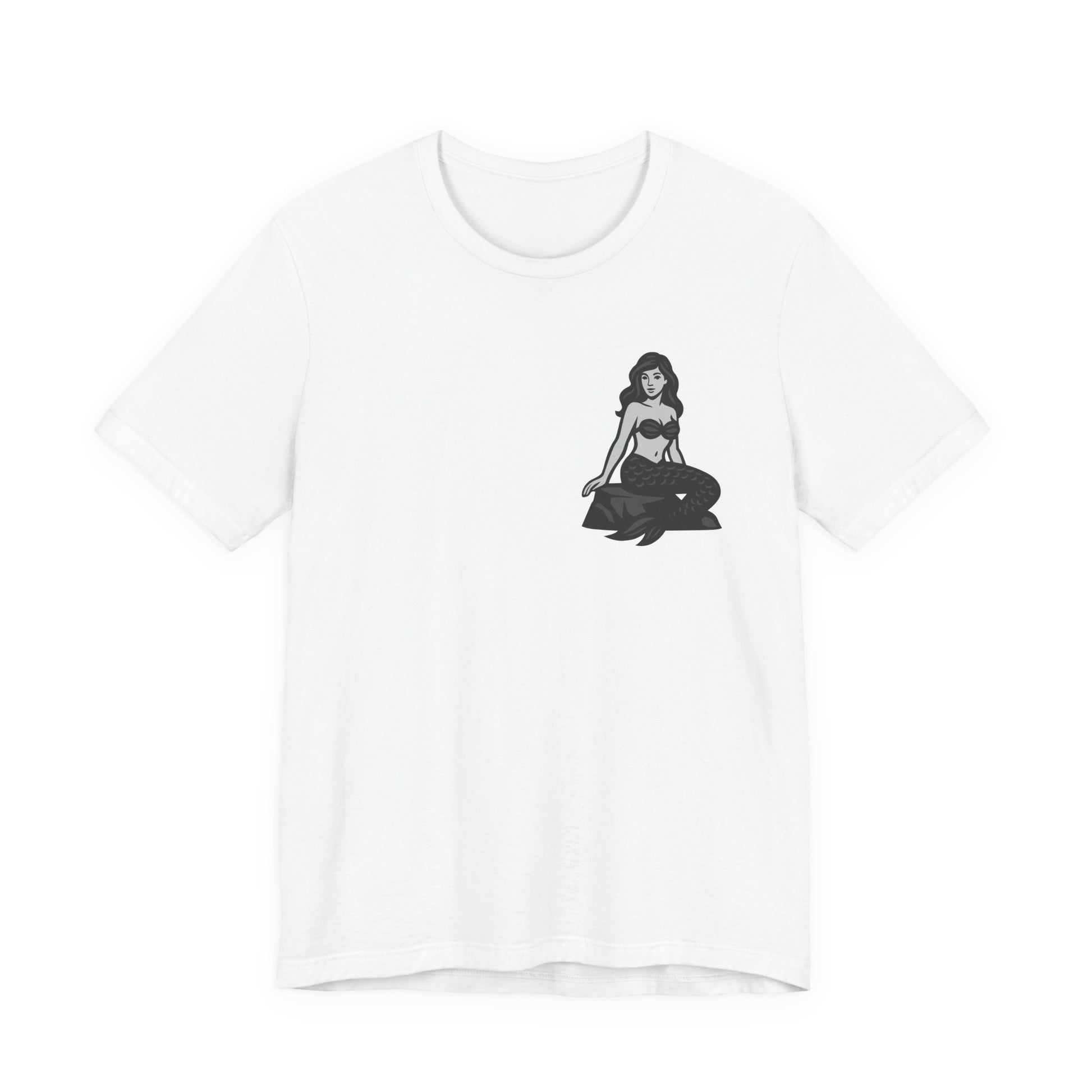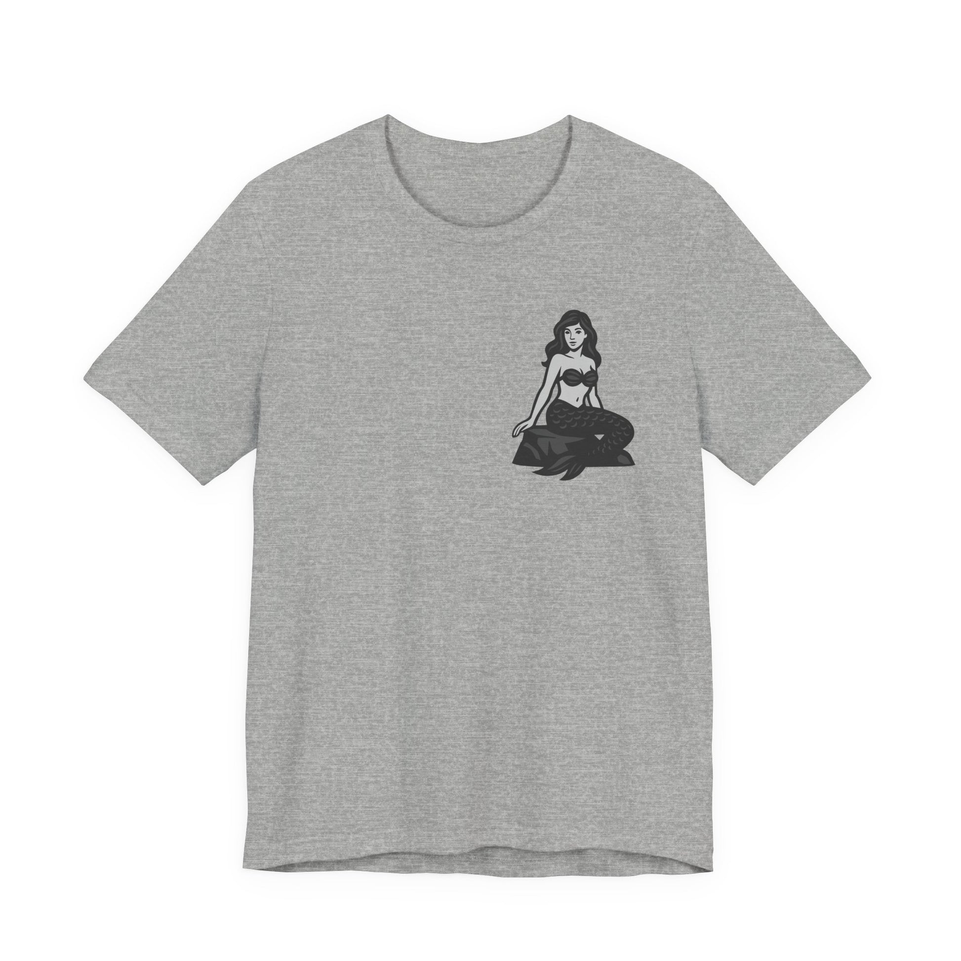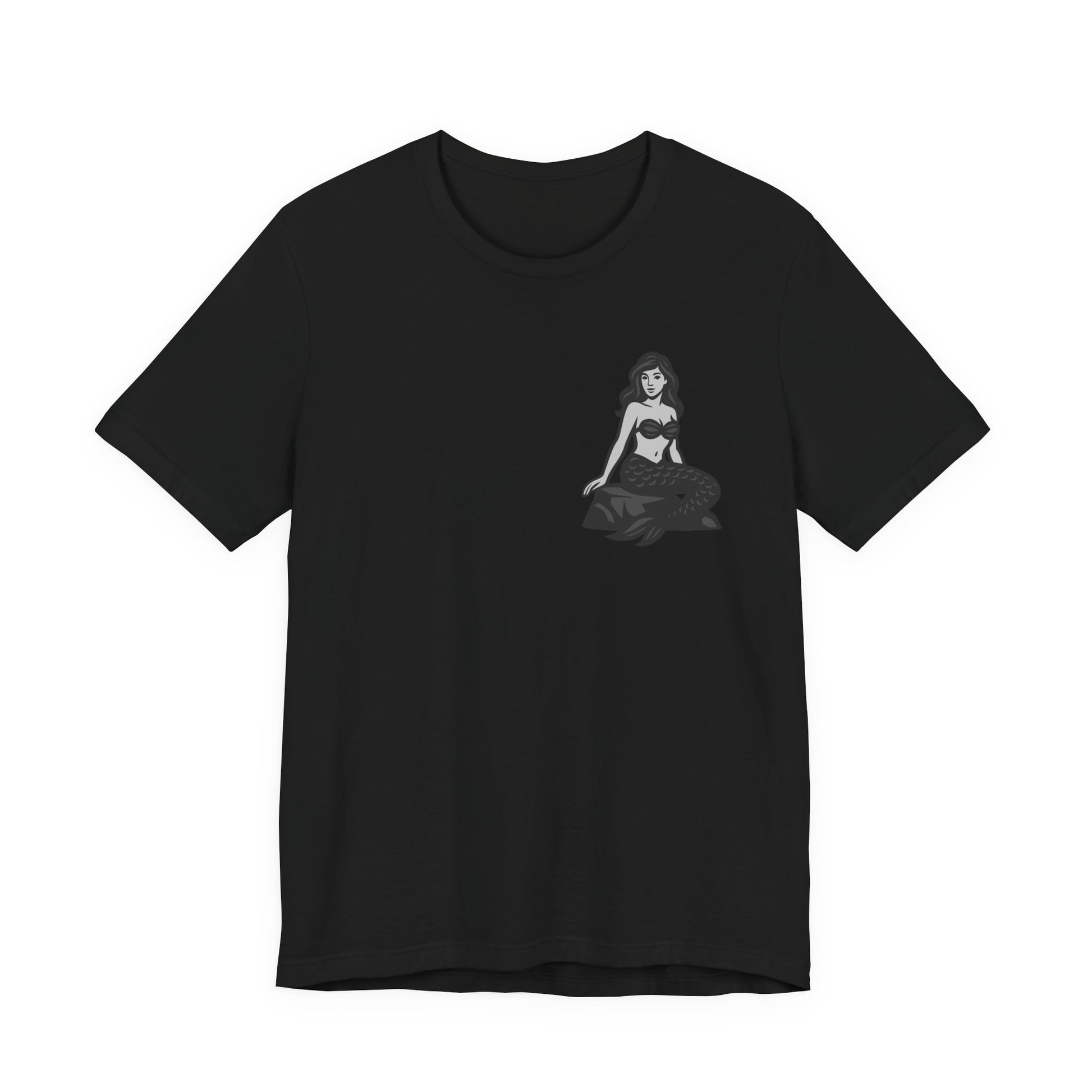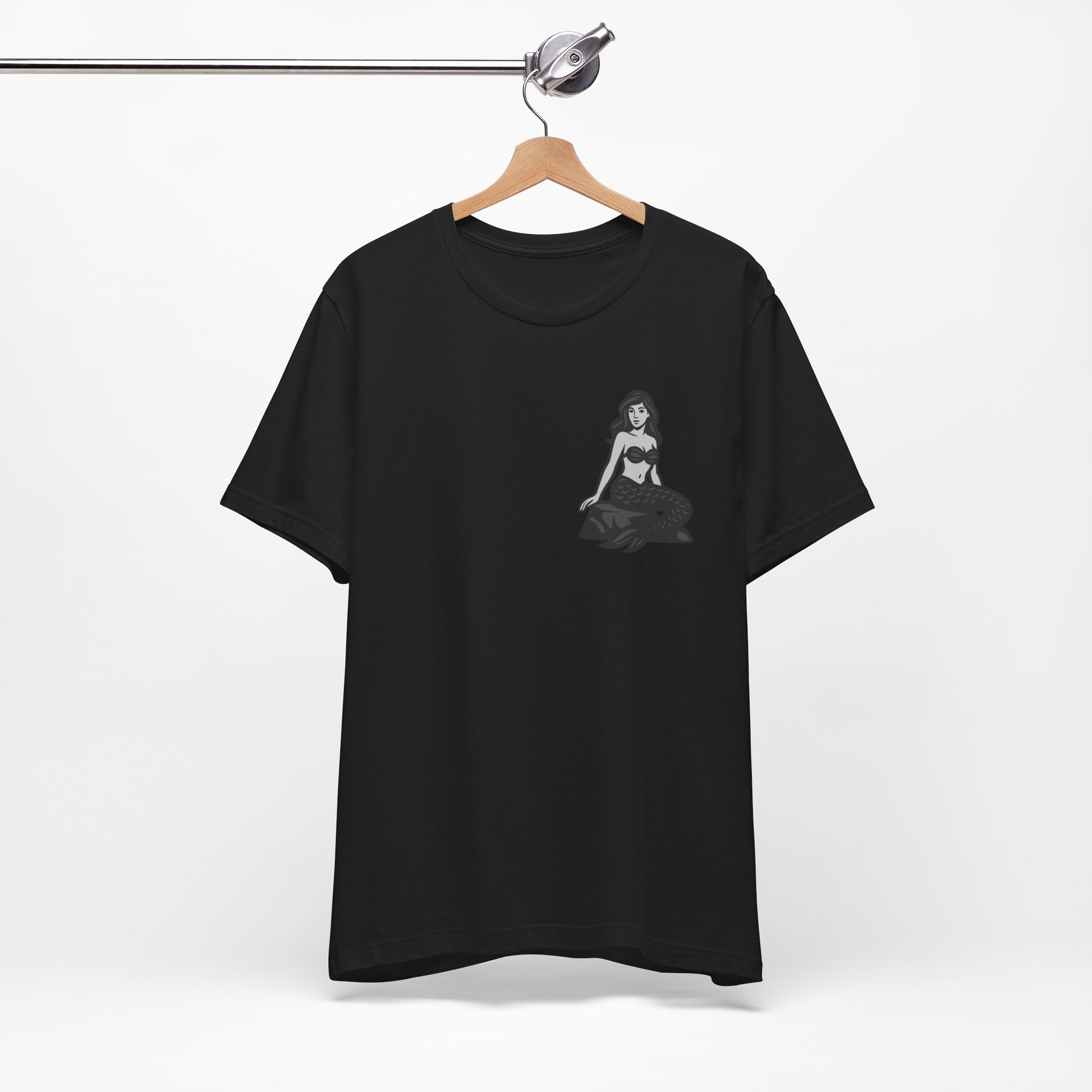 Mermaid Graphic T-Shirt – Dark Theme Grayscale Siren on Rock Design on Black Tee with Fantasy Vibes and Modern Ghost Effect. Unisex Jersey Short Sleeve Tee
