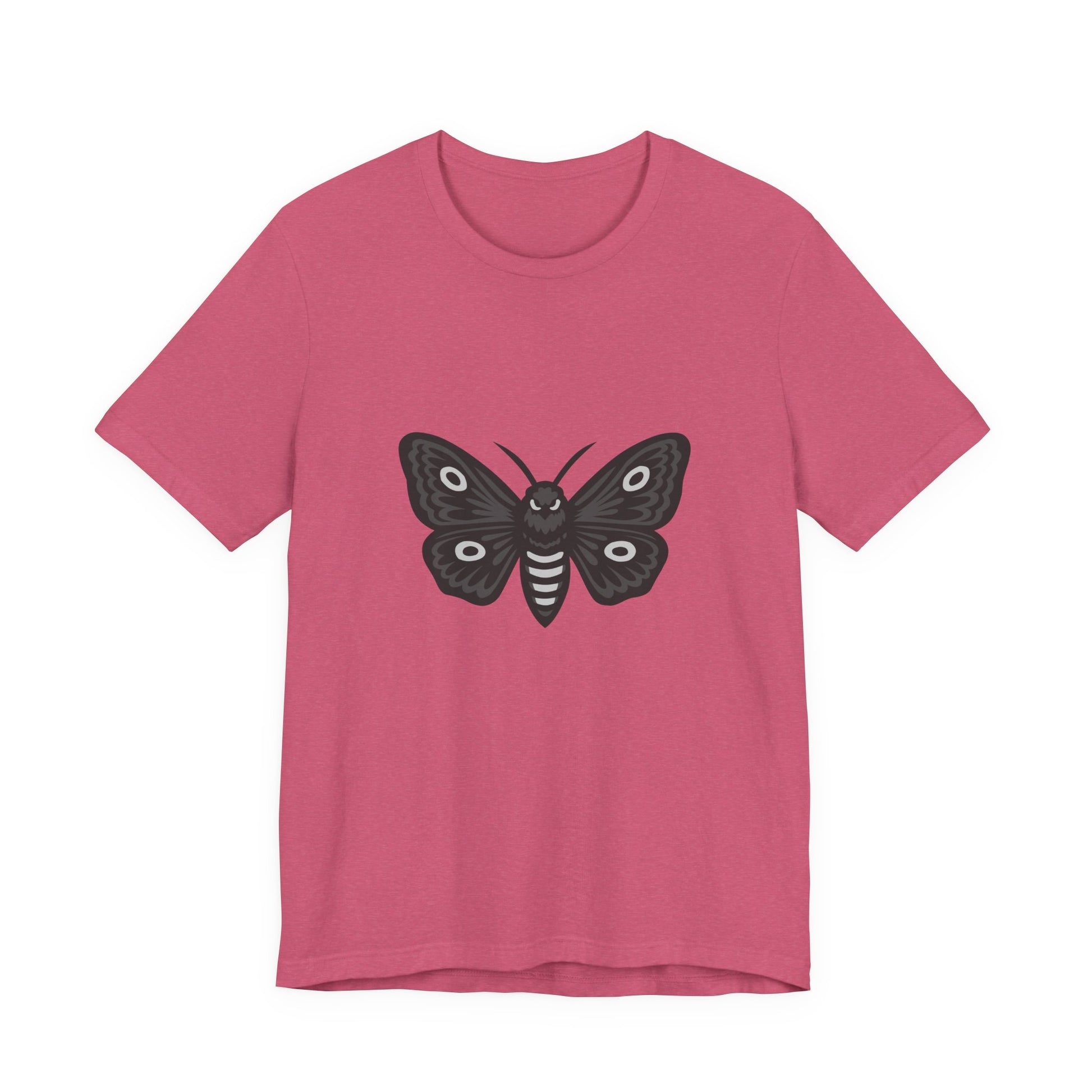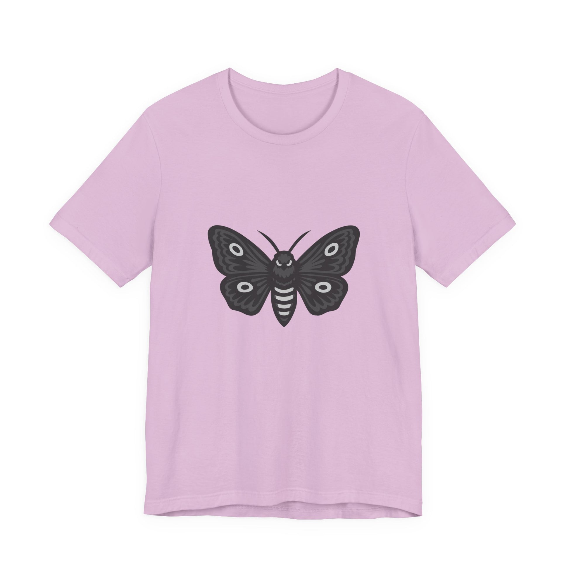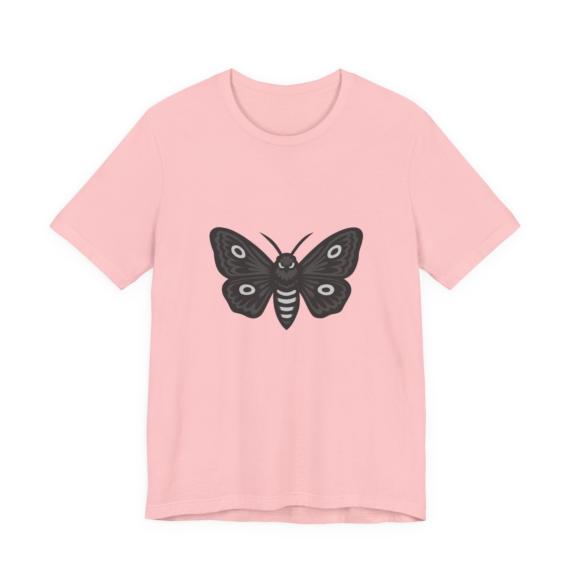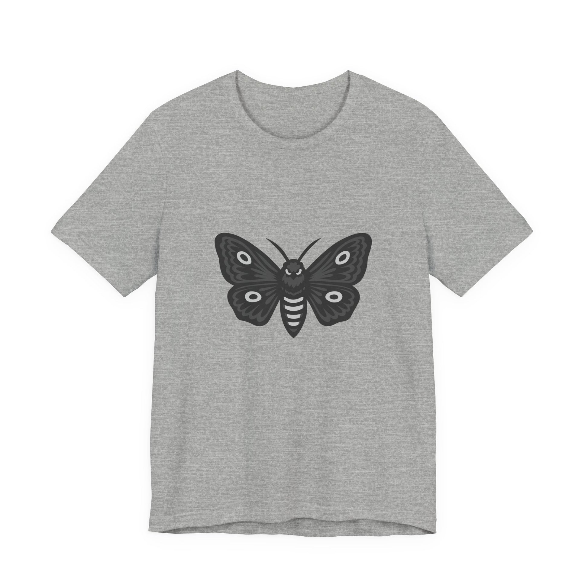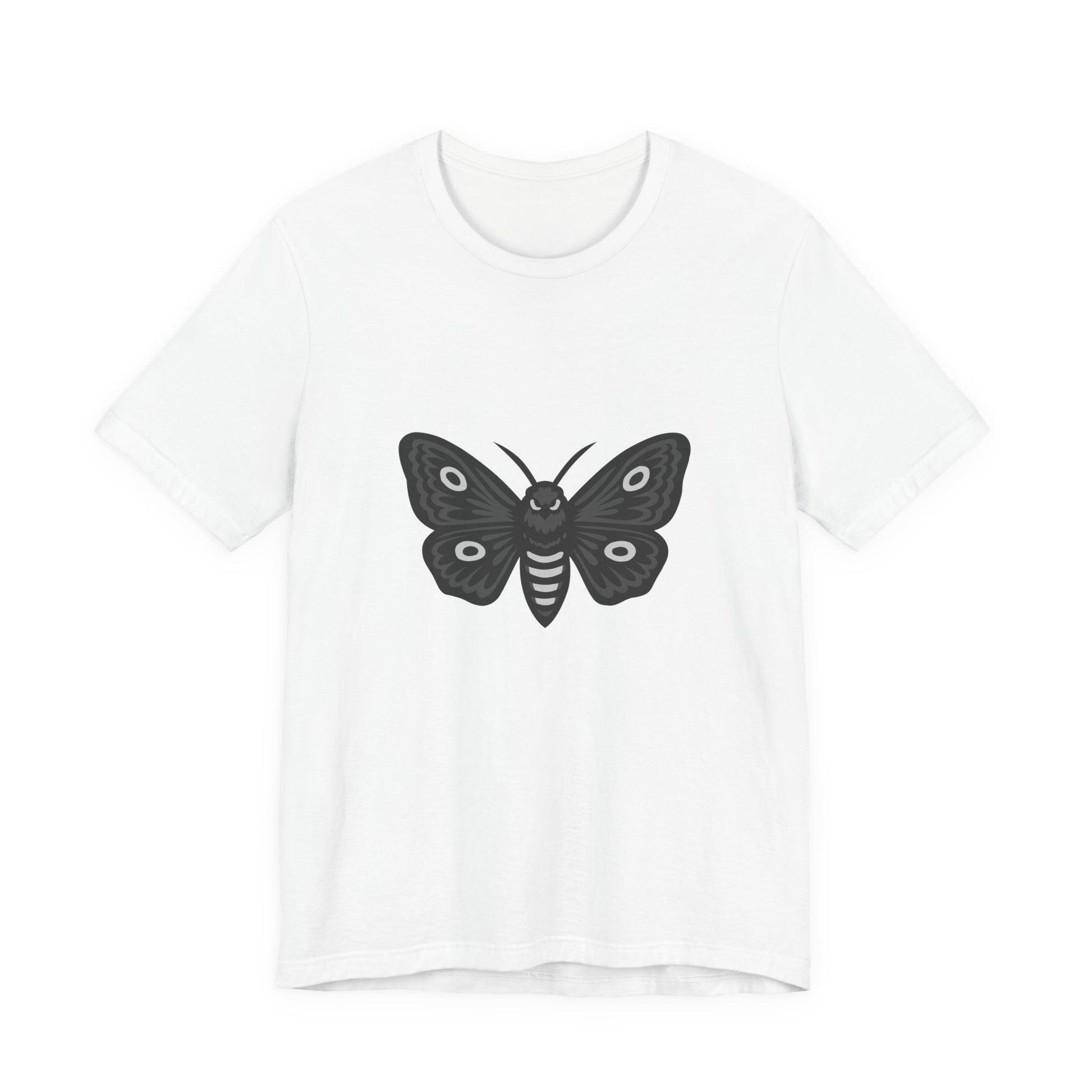 Moth Graphic T-Shirt – Dark Theme Grayscale Winged Insect Design on Black Tee with Gothic Mood and Subtle Modern Ghost Effect. Unisex Jersey Short Sleeve Tee