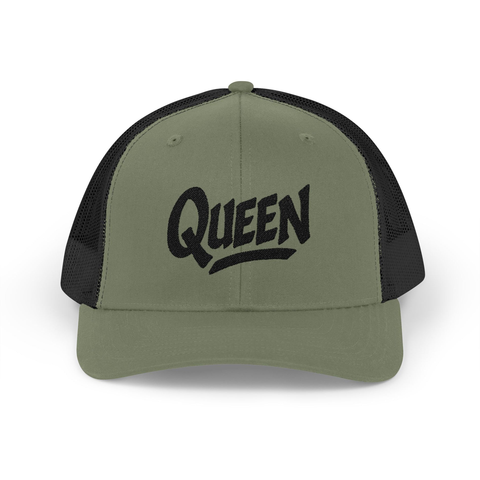 Queen Trucker Hat – Embroidered Crown Hat for Confident Women. Black Letters