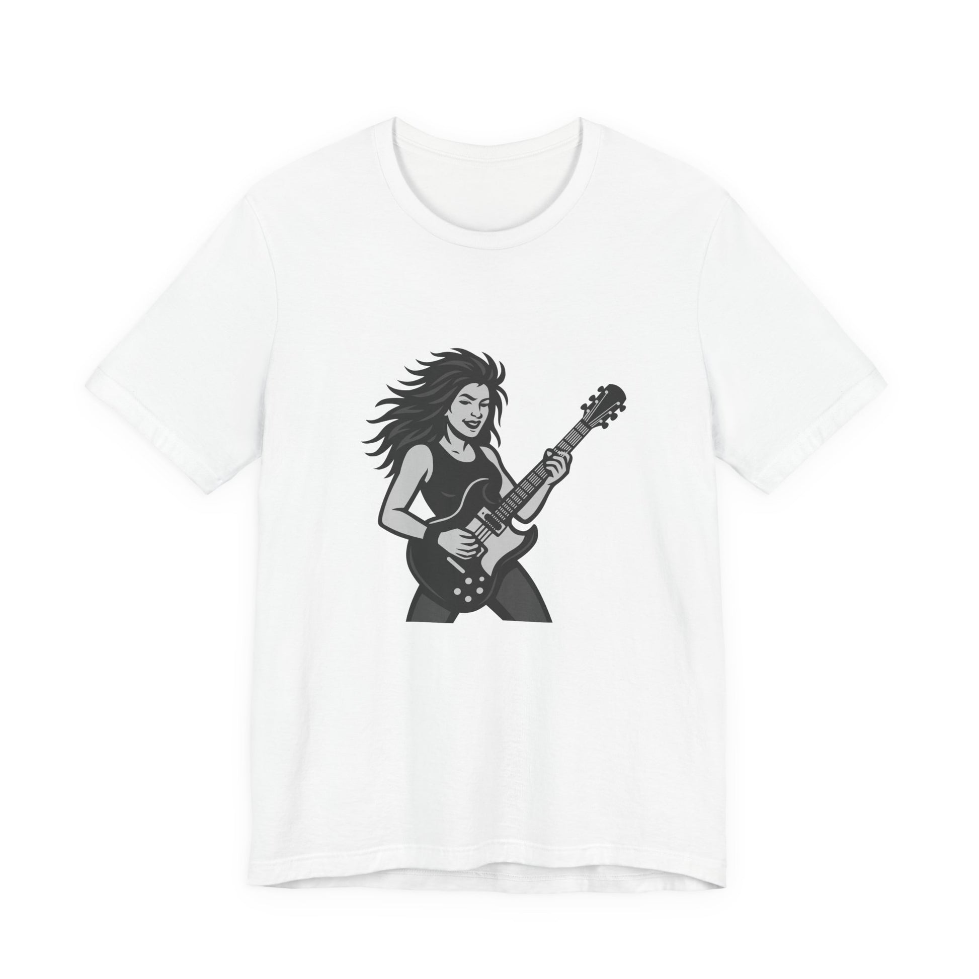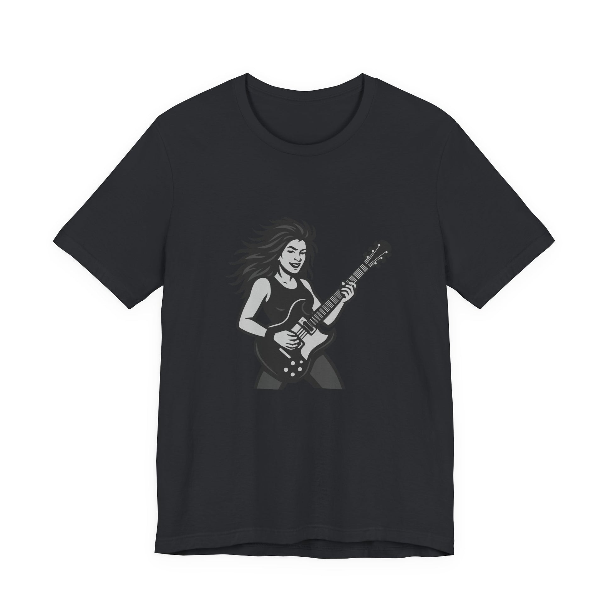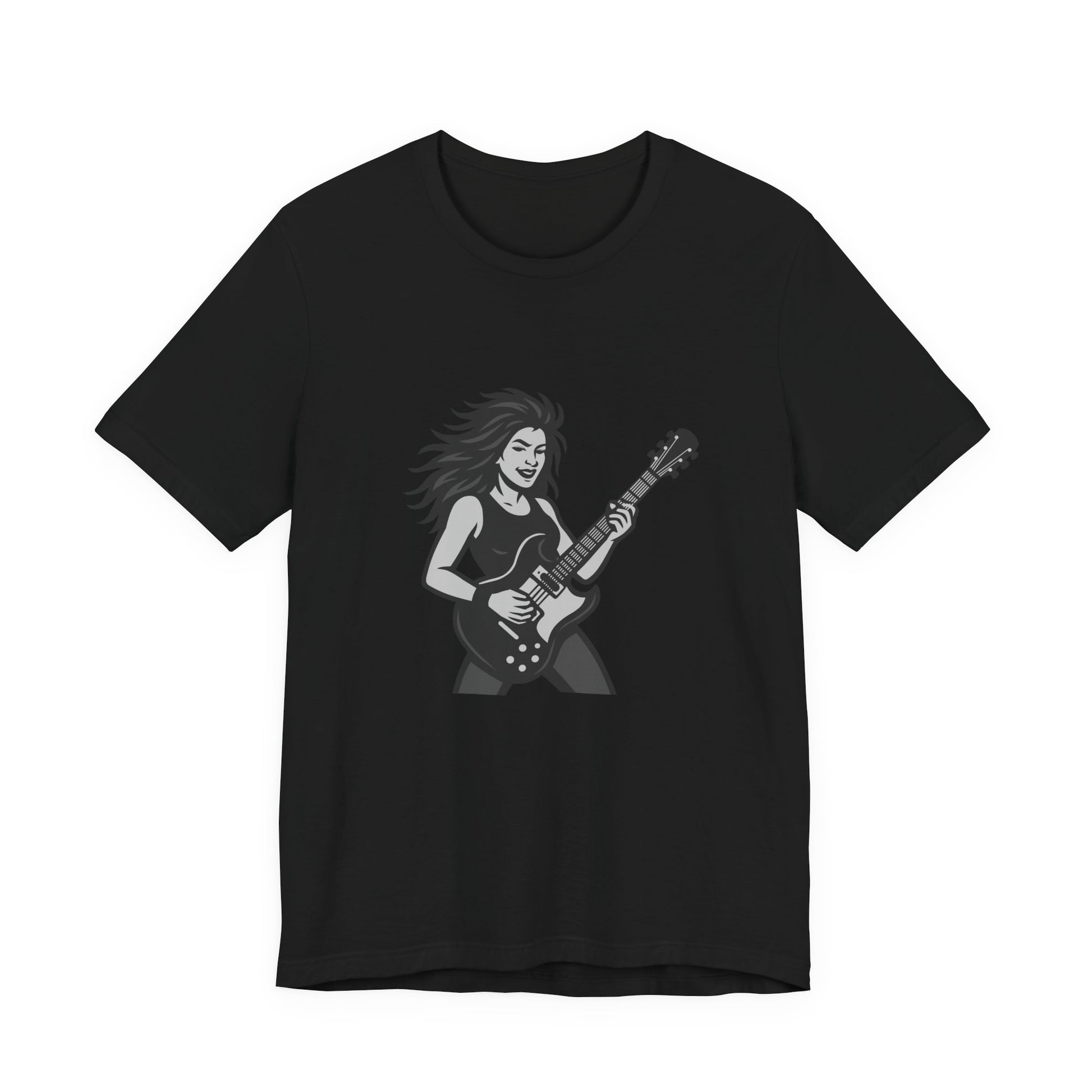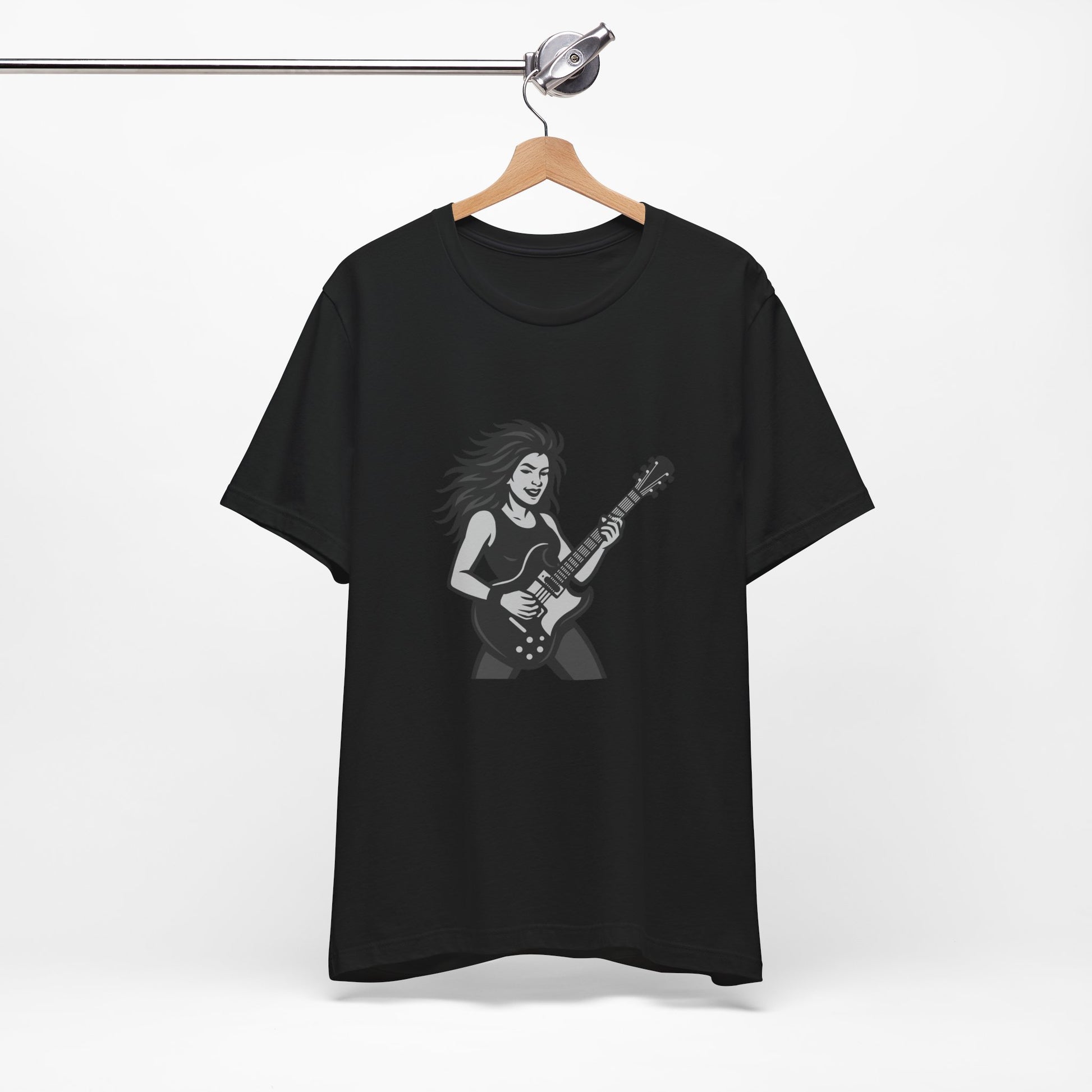 Rock Guitar Girl Graphic T-Shirt – Dark Theme Grayscale Electric Guitarist Design on Black Tee with Music Attitude and Modern Ghost Effect. Unisex Jersey Short Sleeve Tee