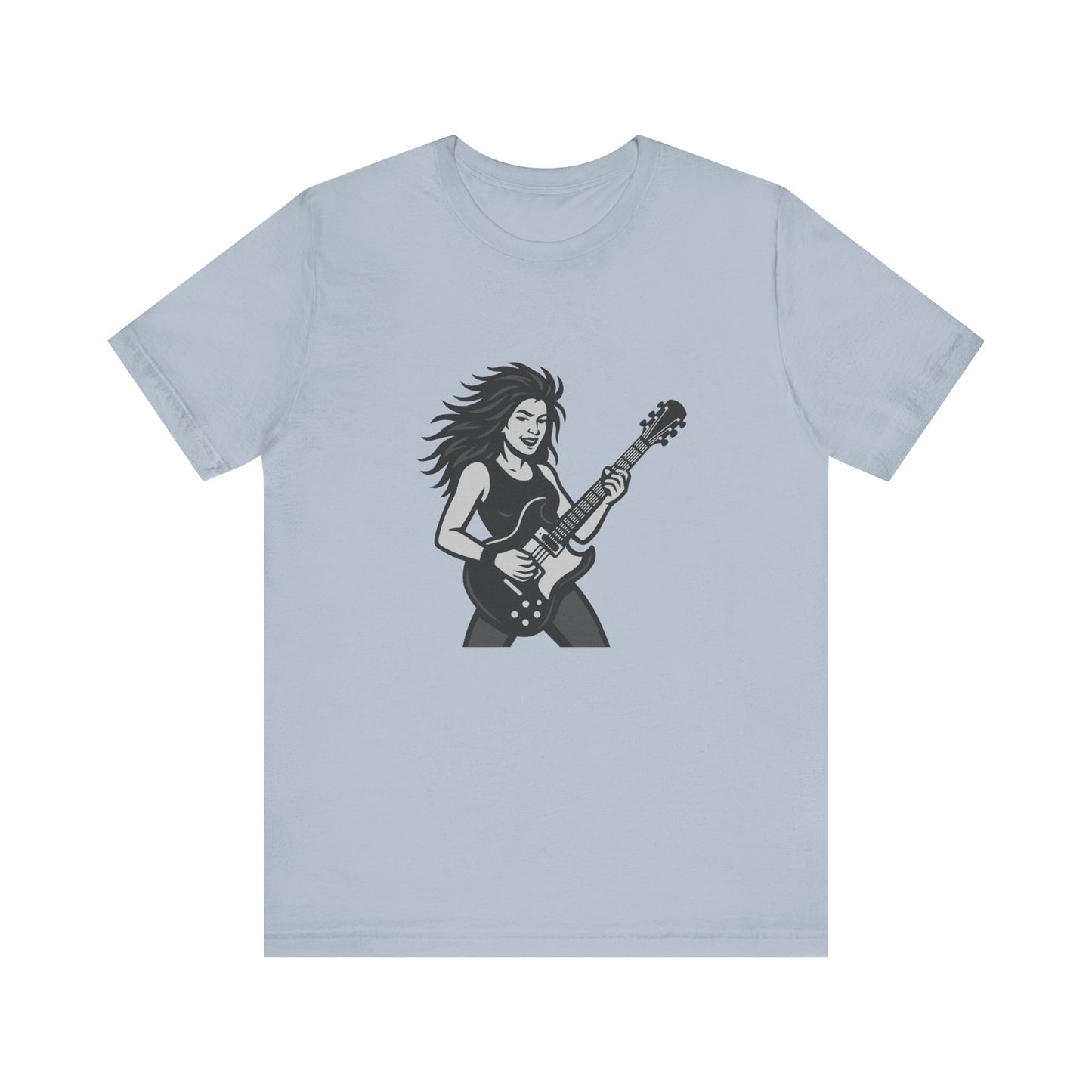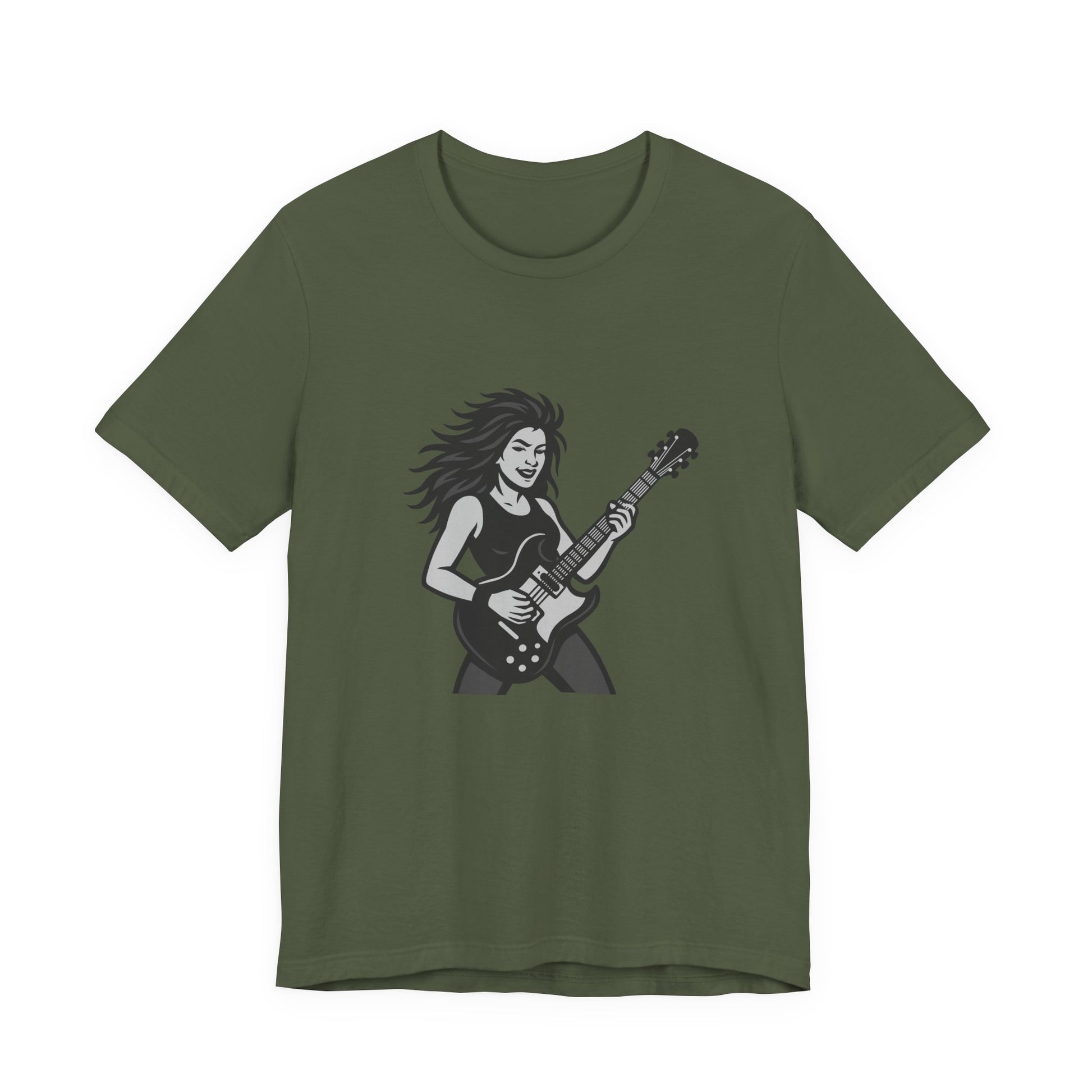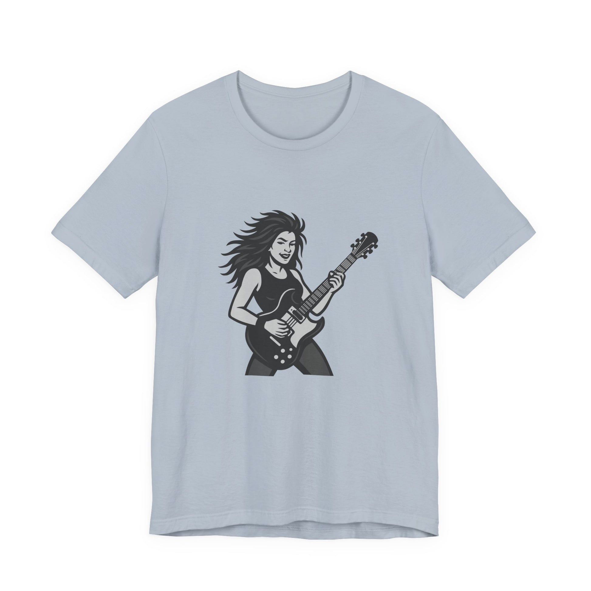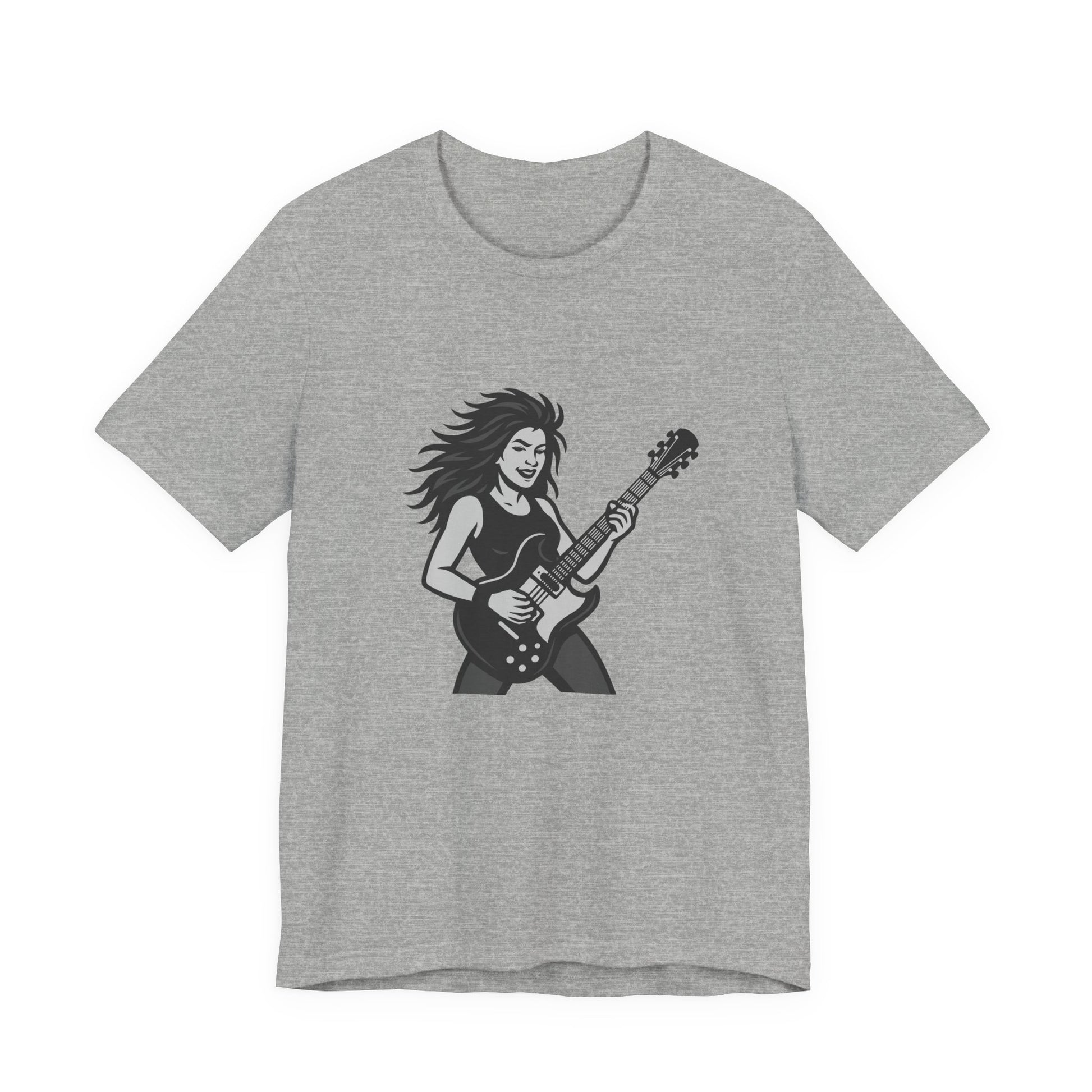 Rock Guitar Girl Graphic T-Shirt – Dark Theme Grayscale Electric Guitarist Design on Black Tee with Music Attitude and Modern Ghost Effect. Unisex Jersey Short Sleeve Tee