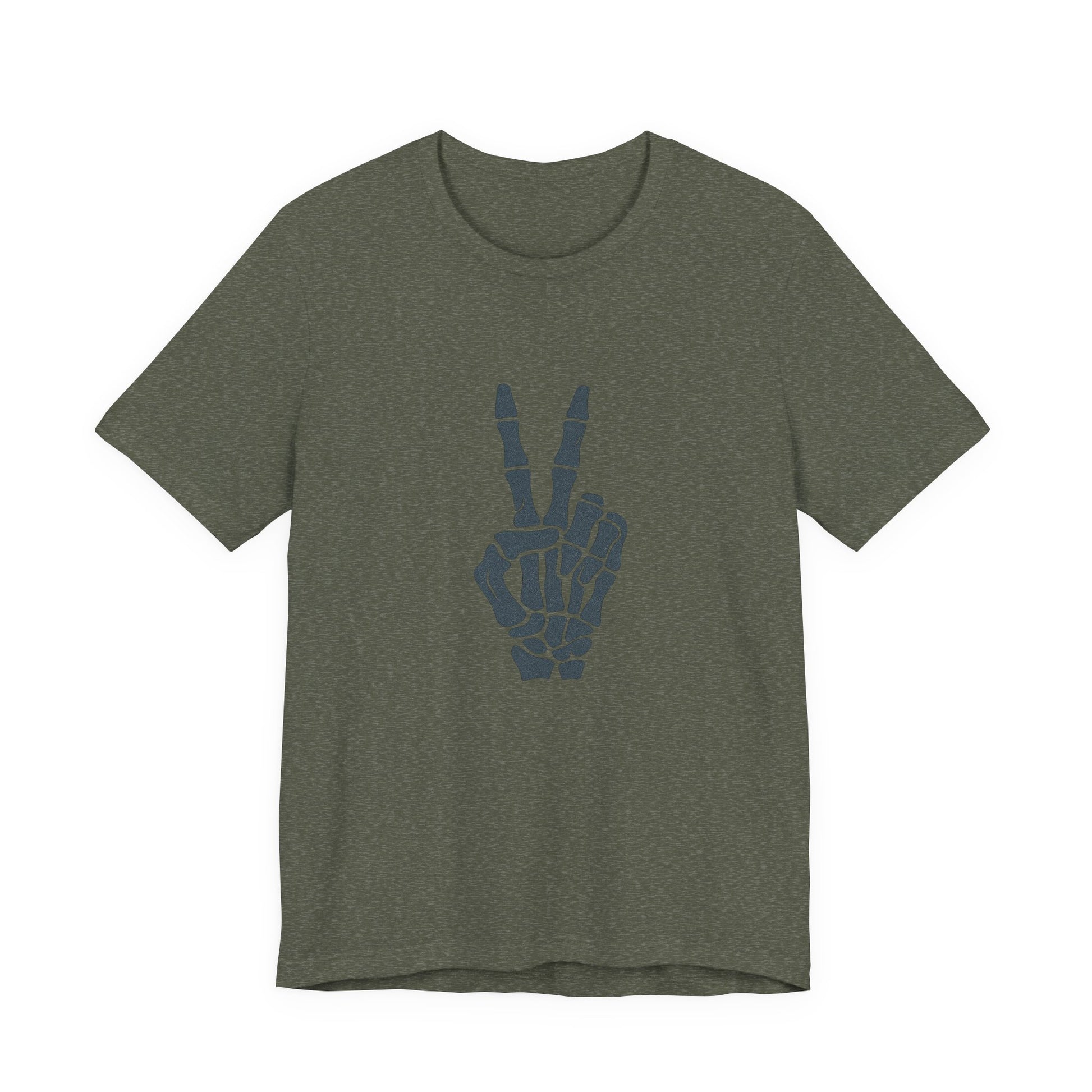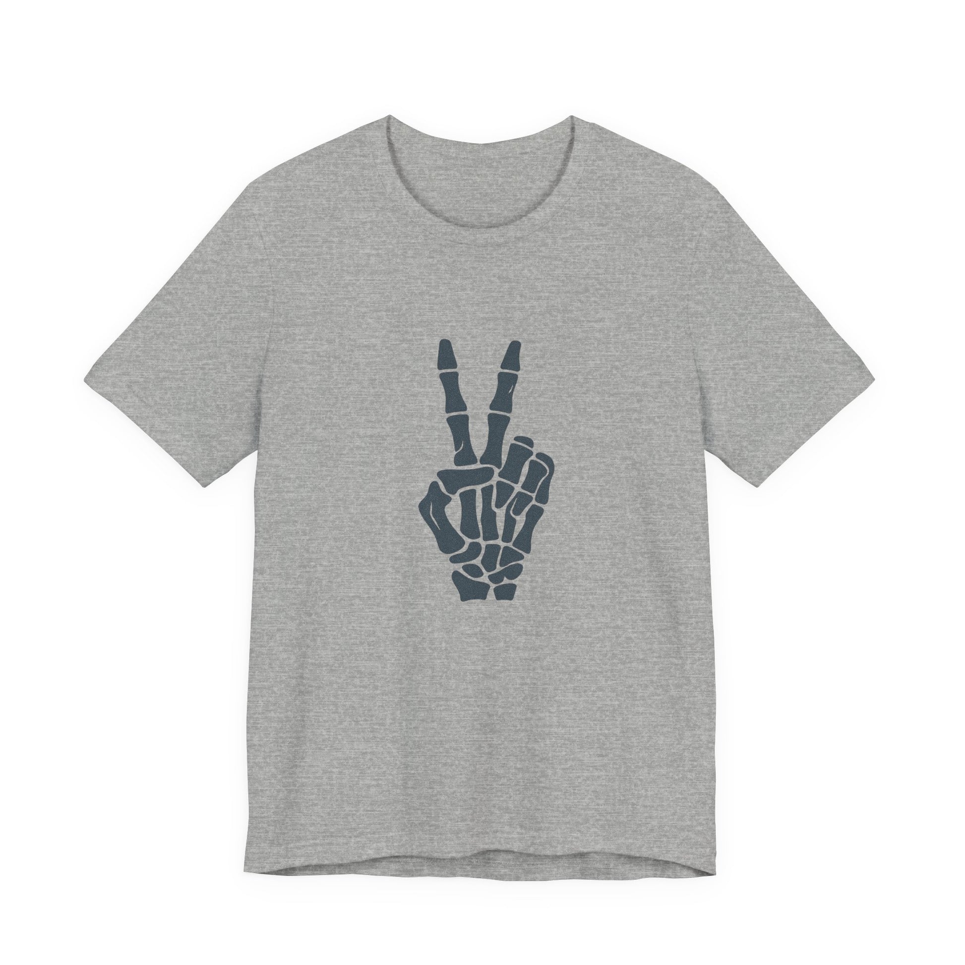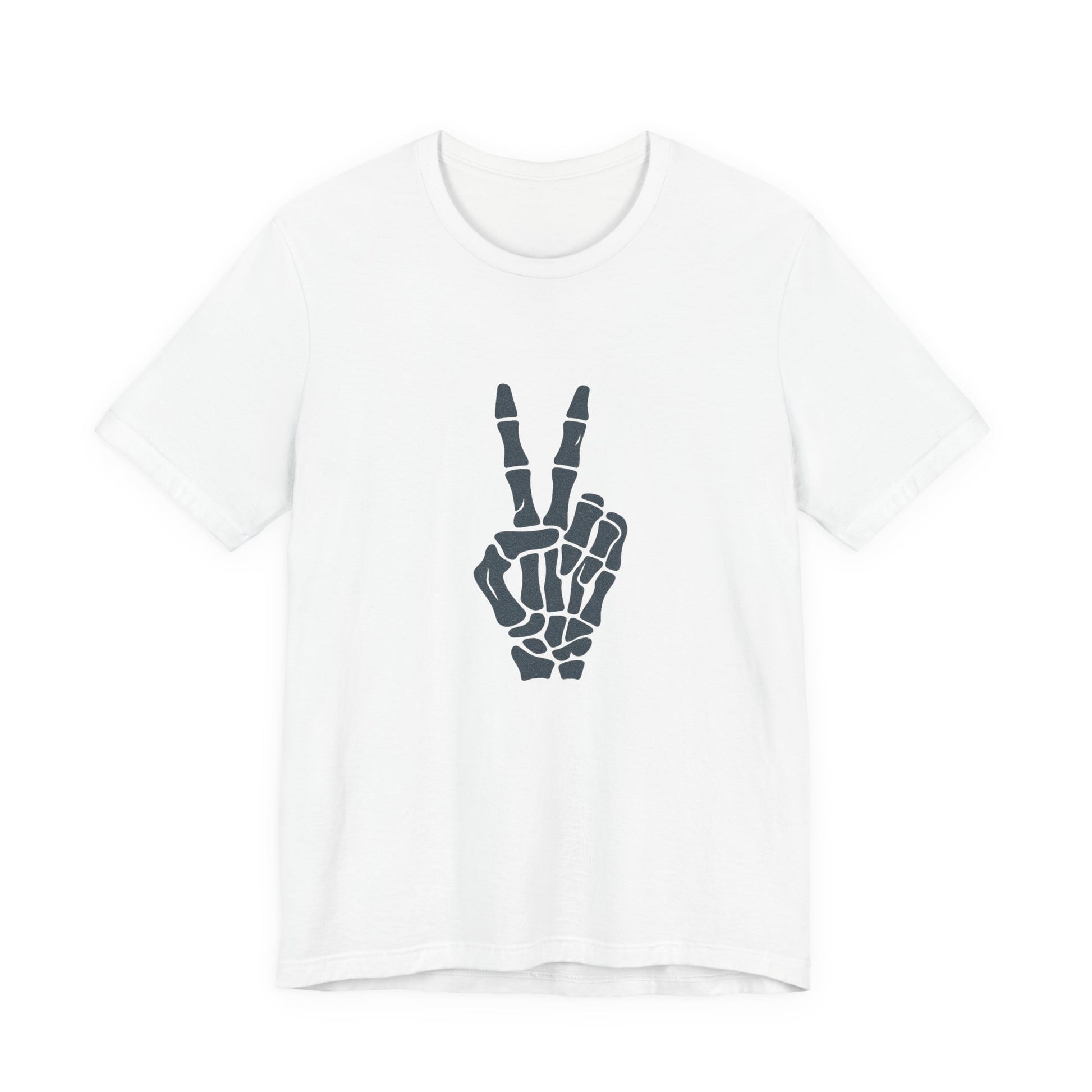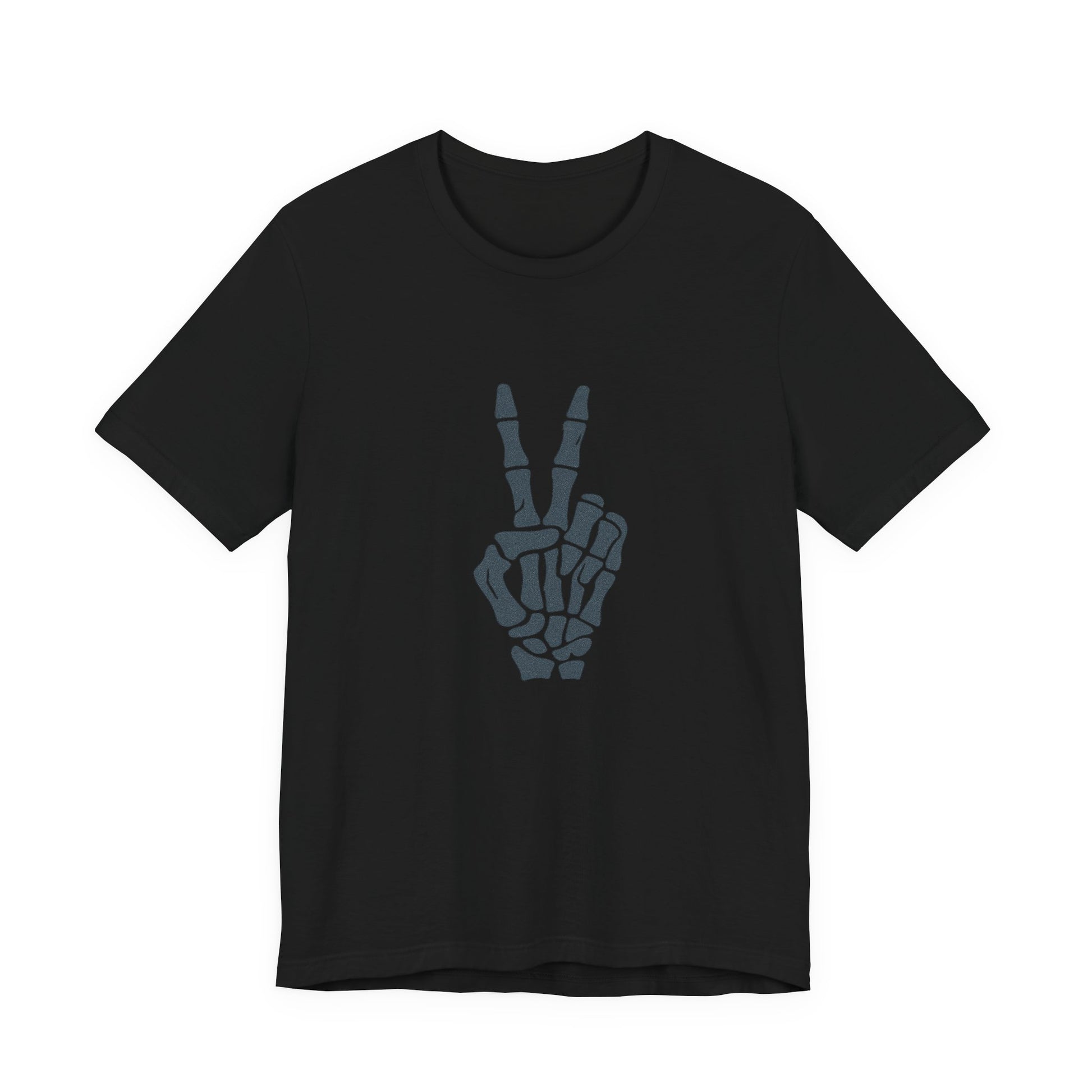 Skeleton Peace Hand Graphic T-Shirt – Gritty Dark Theme Grayscale Bones on Black Tee with Rebellious Calm and Modern Ghost Effect. Unisex Jersey Short Sleeve Tee
