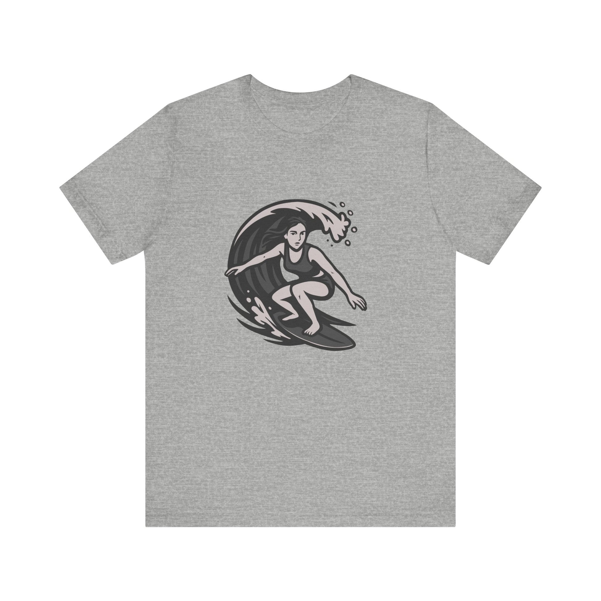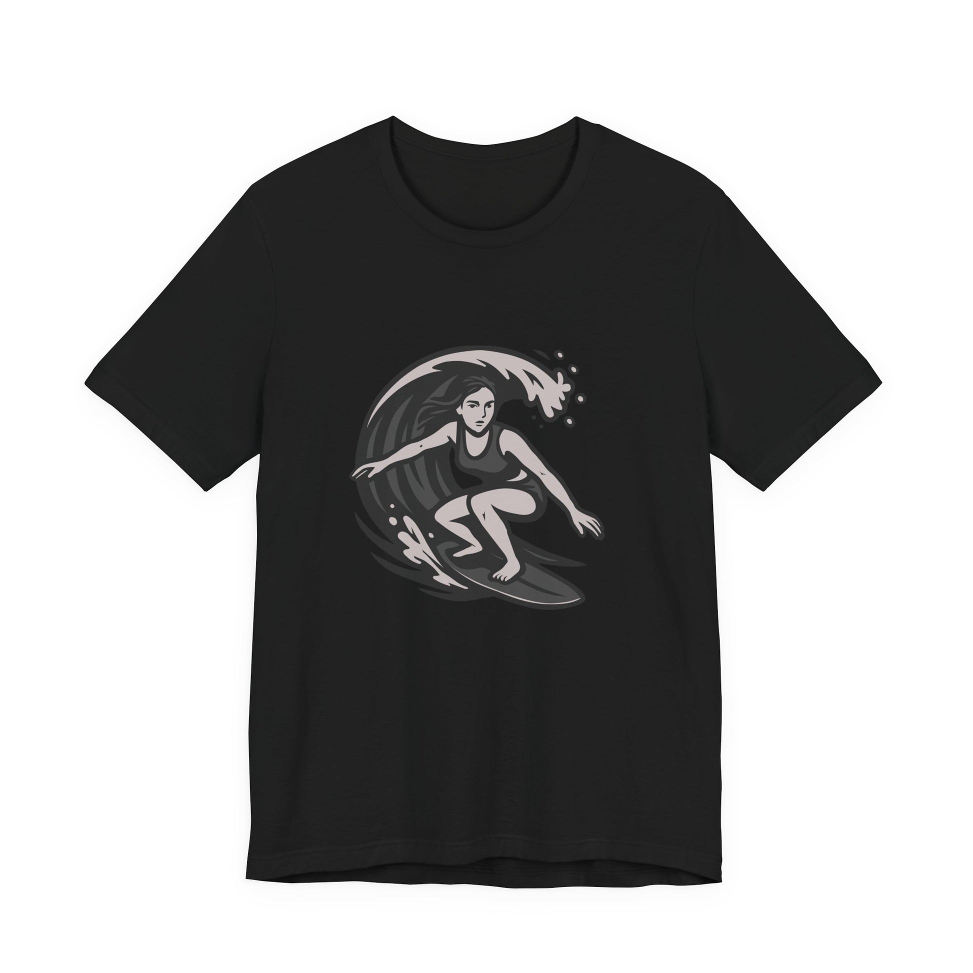Surf Girl Graphic T-Shirt – Dark Theme Grayscale Female Surfer Riding Wave on Black Tee with Flow State Energy and Modern Ghost Effect. Unisex Jersey Short Sleeve Tee