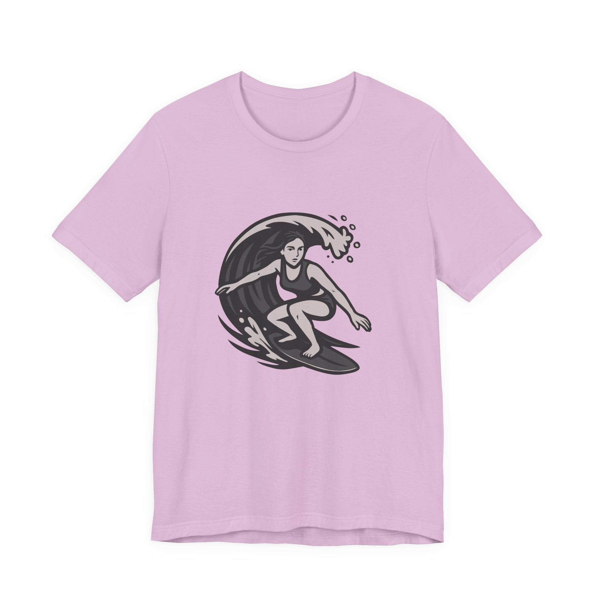 Catch your own quiet wave with this surf girl graphic tee. Featuring a grayscale surfer crouched mid-ride inside a curling wave, this design captures motion, focus, and freedom. Printed with a modern ghost effect, the artwork blends into the black fabric for a chill, low-contrast aesthetic. For those who surf the edge without needing to shout about it.