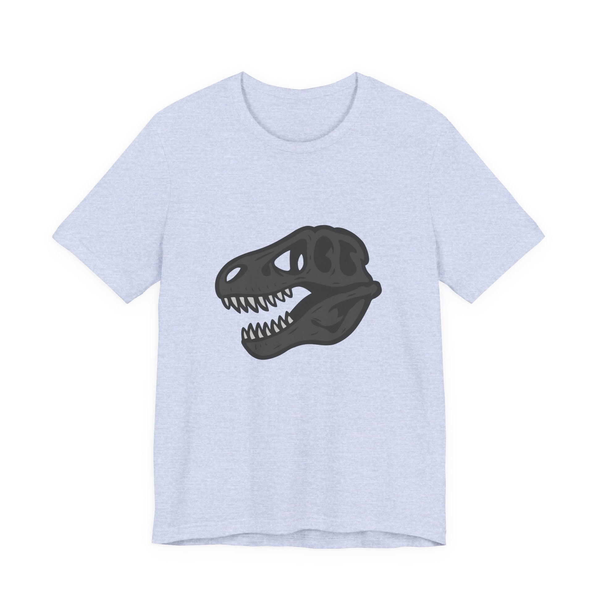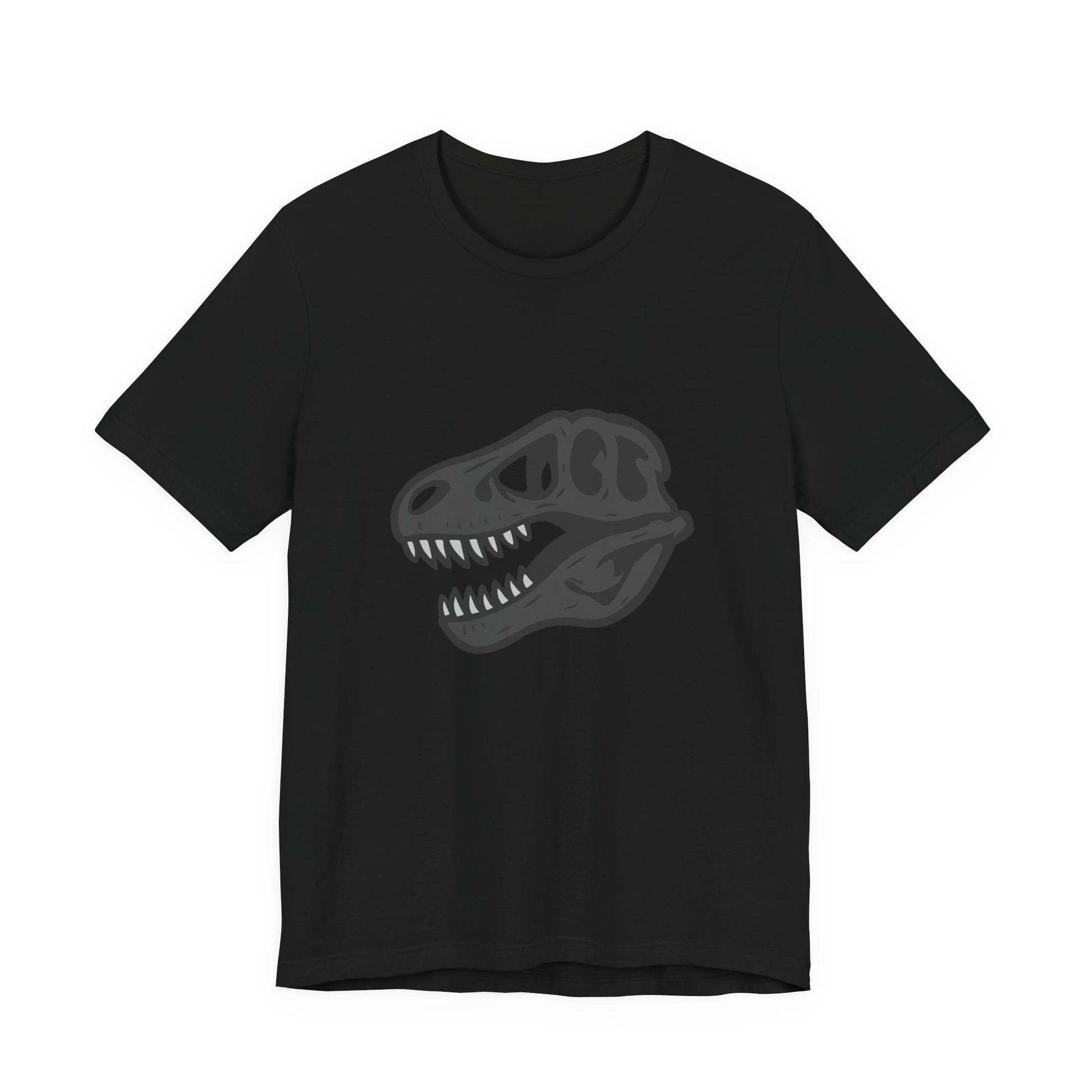 T-Rex Skull Graphic T-Shirt – Dark Theme Grayscale Dinosaur Skeleton Design on Black Tee with Prehistoric Edge and Modern Ghost Effect. Unisex Jersey Short Sleeve Tee